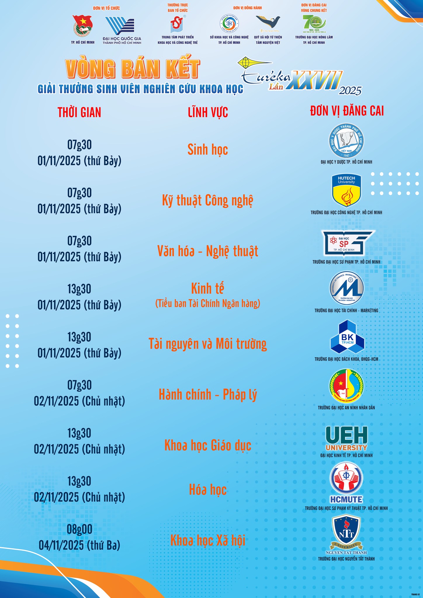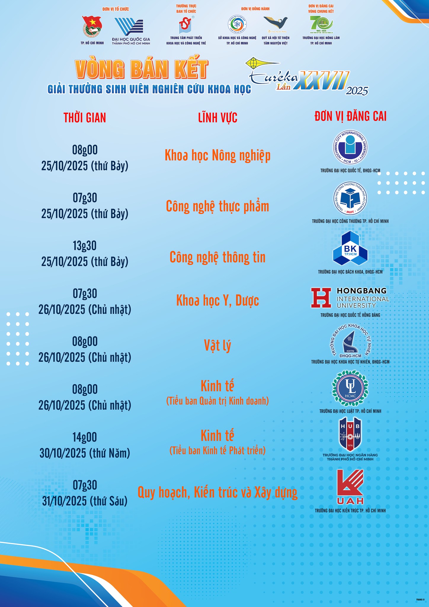 Hiện BTC đã công bố lịch trình Vòng Bán kết, diễn ra từ ngày 25/10 đến 04/11/2025 tại 16 Trường Đại học trên địa bàn TP. Hồ Chí Minh. Các nhóm sinh viên Hoa Sen sẽ lần lượt trình bày kết quả nghiên cứu của mình trước hội đồng chuyên môn, thể hiện năng lực tư duy khoa học và kỹ năng phản biện – bước quan trọng để tiến vào Vòng Chung kết Euréka 2025.