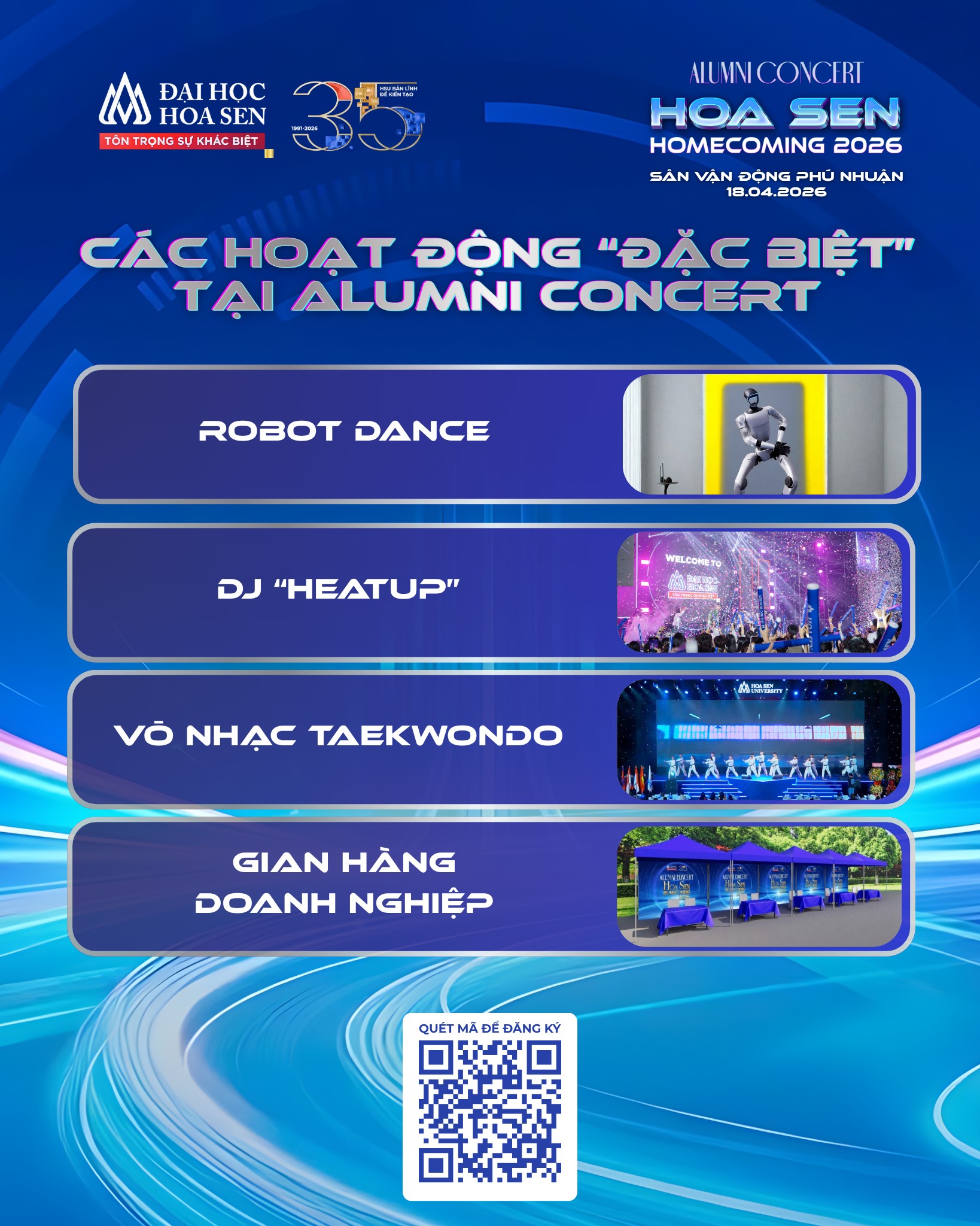 Alumni Concert – Hoa Sen Homecoming 2026 mang đến nhiều giá trị vượt ra ngoài một sự kiện giải trí. Sinh viên tham gia không chỉ hòa mình vào âm nhạc mà còn nhận về những trải nghiệm đáng nhớ: sở hữu các thiết kế merchandise riêng, tích lũy điểm rèn luyện, tận hưởng không gian ẩm thực đa dạng và chia sẻ khoảnh khắc cùng bạn bè, người thân.