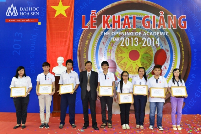 Lors de la cérémonie, l’université a également remis 40 bourses d’études totalisant 1.130.000.000 VN dong aux étudiants nouvellement intégrés dans l’environnement culturel de Hoa Sen. Cela représente une aide matérielle et spirituelle de l’équipe des enseignants de l’université dédiée aux nouveaux étudiants. Les bourses d’études de Hoa Sen de 2013 – 2014 comprennent les suivantes: bourses d’excellences, celles de l’encouragement, celles décernées aux étudiants défavorisés mais studieux, celles pour l’encouragement des études à la faculté des Sciences et des Technologies et l’encouragement des études collégiales