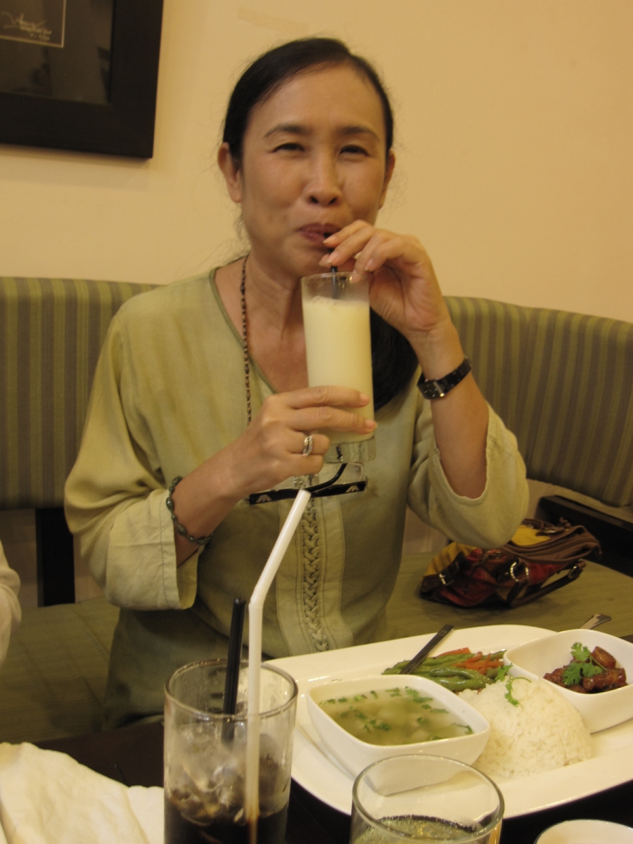 Khác với sự chờ đợi mà chúng tôi đã từng e ngại khi đến Vatel, món ăn được dọn ra nhanh chóng, đúng yêu cầu và vừa miệng, được chúng tôi thưởng thức rất nhiệt tình. “Ông chủ” ân cần hỏi ý kiến chúng tôi từng món ăn, thức uống. Hằng ngày, chúng tôi hay uống trà đá khi ăn trưa nhưng hôm nay, mỗi người đã chọn thức uống cho mình. Đây là ly sữa đậu nành được pha chế tại chỗ, café cũng do nhà hàng chế biến với 4 loại café khác nhau tạo nên một hương vị đặc biệt. Các loại thức uống thông thường có giá từ 15.000 đến 20.000đồng.