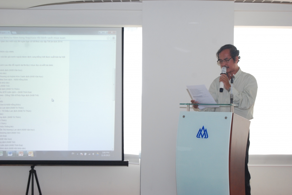 Ông Mai Sơn – Trưởng ban Tu thư Trường ĐH Hoa Sen giới thiệu cuộc thi “Bình sách mùa xuân”