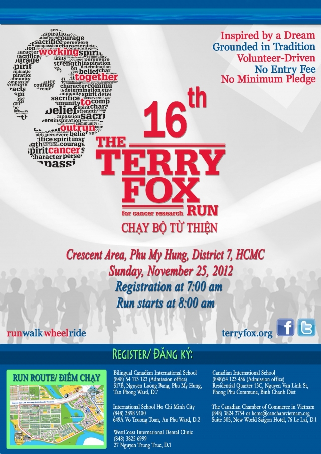Vào lúc 7:00 sáng Chủ nhật, ngày 25/11, tại Khu Crescent Phú Mỹ Hưng, Quận 7, Phòng Thương mại Canada và Tổng Lãnh sự quán Cananda tại TP.HCM sẽ thực hiện chương trình Terry Fox Run 2012 (Chạy bộ từ thiện)