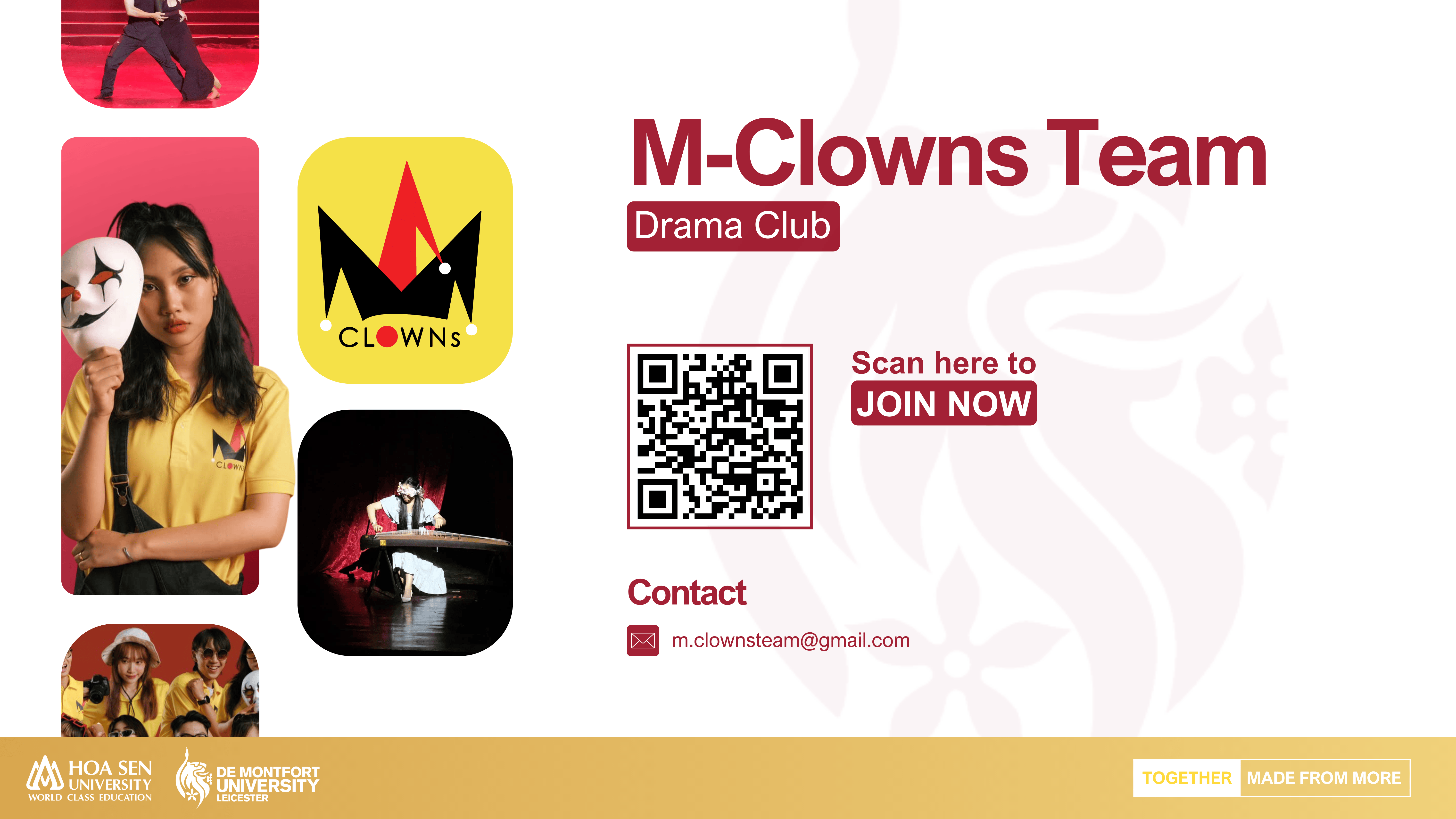 M-CLOWNs is the first Drama Club at Hoa Sen University, established in 2014. The club was founded with the goal of providing a healthy and entertaining artistic platform for students both within and outside the university. In addition, M-CLOWNs aims to create opportunities for students to explore and develop their passion for stage drama. Moreover, members have the chance to connect with one another, support performances in student projects, or participate in drama performances at industry events, faculty activities, and group gatherings.