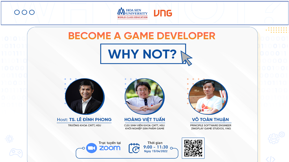 “Become a game developer” là chủ đề mà nhiều bạn trẻ rất quan tâm với sự có mặt của khách mời anh Võ Toàn Thuận đến từ Công ty Vinagame (VNG) – một trong những công ty nổi tiếng về cung cấp sản phẩn giải trí và game hàng đầu tại Việt Nam, và một Game Developer là bạn Hoàng Việt Tuấn – cựu sinh viên Khoa Công nghệ thông tin, diễn ra trực tuyến vào ngày 15/4/2022.