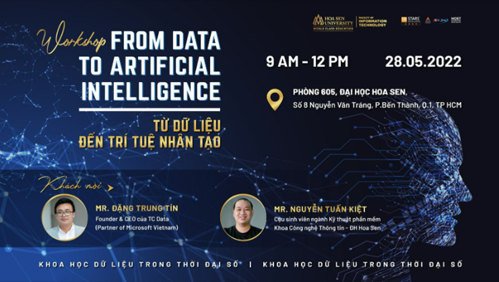 Và hội thảo cuối cùng khép lại chuỗi workshop của Khoa CNTT, “Từ Khoa học dữ liệu đến Trí tuệ nhân tạo – From Data to Artificial Intelligence” đã diễn ra vào ngày 28/5/2022 tại hội trường 605 Nguyễn Văn Tráng, Đại học Hoa Sen. Với các diễn giả là Ông Đặng Trung Tín – Founder & CEO của TC Việt nam (Partner of Microsoft Vietnam) và bạn Nguyễn Tuấn Kiệt – cựu sinh viên ngành Kỹ thuật phần mềm – Khoa Công nghệ thông tin – Trường Đại học Hoa sen.