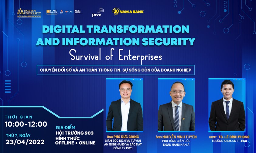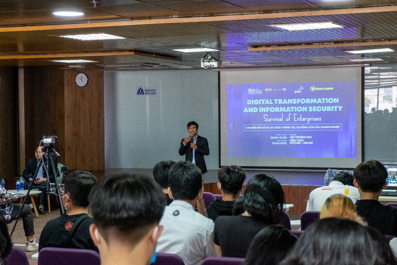 Nắm bắt được vấn đề này, vào sáng ngày 23/04/2022, tại Trụ sở chính Nguyễn Văn Tráng, Khoa Công Nghệ Thông Tin – Trường Đại học Hoa Sen đã phối hợp với PwC – một doanh nghiệp trong nhóm Big 4 chuyên về các dịch vụ kiểm toán và tư vấn lừng lẫy thế giới và đến từ lĩnh vực tài chính ngân hàng, đại diện tiêu biểu cho chuyển đổi số mạnh mẽ tại Viêt Nam – Ngân hàng Nam Á – tổ chức hội thảo với chủ đề “Chuyển đổi số và an toàn thông tin – Sự sống còn của doanh nghiệp”. Hội thảo thu hút gần 200 người tham gia là các Giảng viên, Sinh viên quan tâm đến vấn đề chuyển đổi số và an toàn thông tin.
