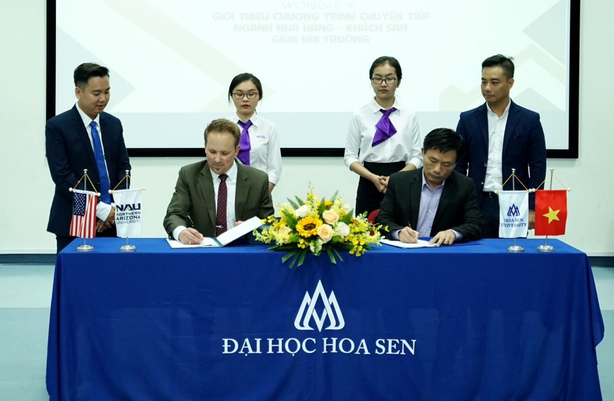 Nhằm đẩy mạnh chương trình liên kết đào tạo với các trường Đại học tại Mỹ, là một phần trong việc quốc tế hóa chương trình đào tạo, mang đến cơ hội cho sinh viên HSU được thực hiện ước mơ du học Mỹ của mình. Sáng ngày 02/5/2019, Trường Đại học Hoa Sen đã tổ chức lễ ký kết thoả thuận hợp tác với Trường Đại học Northern Arizona, Hoa Kỳ trong công tác đào tạo nguồn nhân lực cho nhóm ngành Quản trị Nhà hàng, Khách sạn. Buổi lễ ký kết có sự tham dự của TS. Daniel Palm– Phó Hiệu trưởng trường Đại học Northern Arizona, TS. Vũ Tường Thụy – Phó Hiệu trưởng Trường Đại học Hoa Sen, TS. Lê Minh Thành Phó trưởng khoa Khoa Du lịch và các Giảng viên, sinh viên đến từ 2 trường.