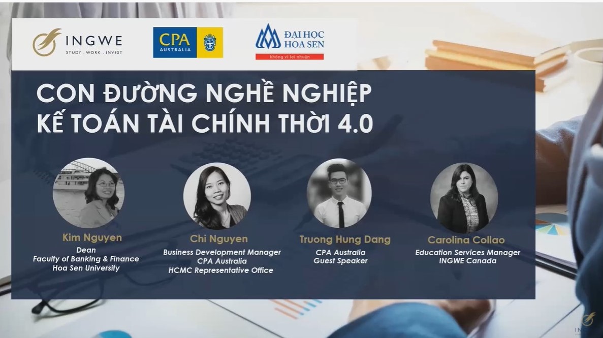 Ngày 8/4/2021, Khoa Tài chính – Ngân hàng trường Đại học Hoa Sen kết hợp với CPA Australia và INGWE Canada tổ chức hội thảo “Con đường nghề nghiệp kế toán 4.0”. Thông qua buổi hội thảo, sinh viên sẽ được cung cấp những kiến thức về nghề kế toán thời đại công nghệ 4.0, học hỏi kinh nghiệm từ những chia sẻ bổ ích của những người đã thành đạt trong lĩnh vực kế toán.