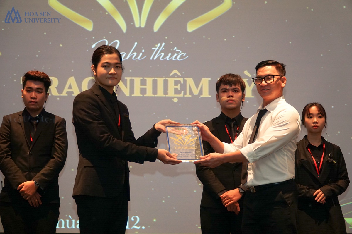 Lê Huỳnh – Trưởng Ban tổ chức cuộc thi I-Hotelier năm 2020 (bìa trái) nhận nghi thức trao nhiệm của cuộc thi.