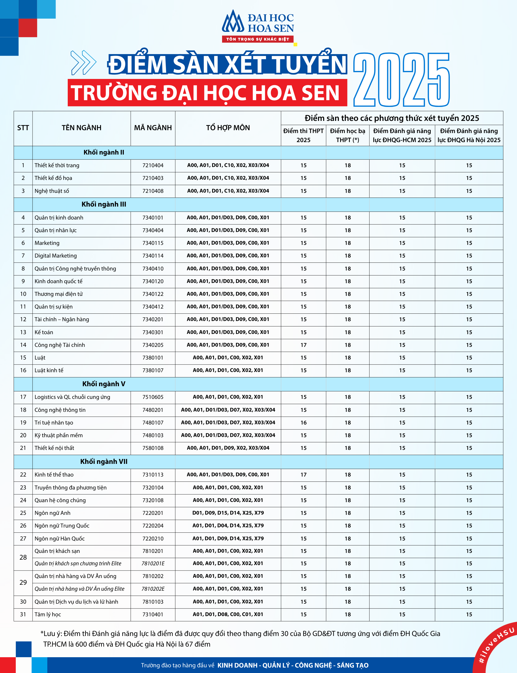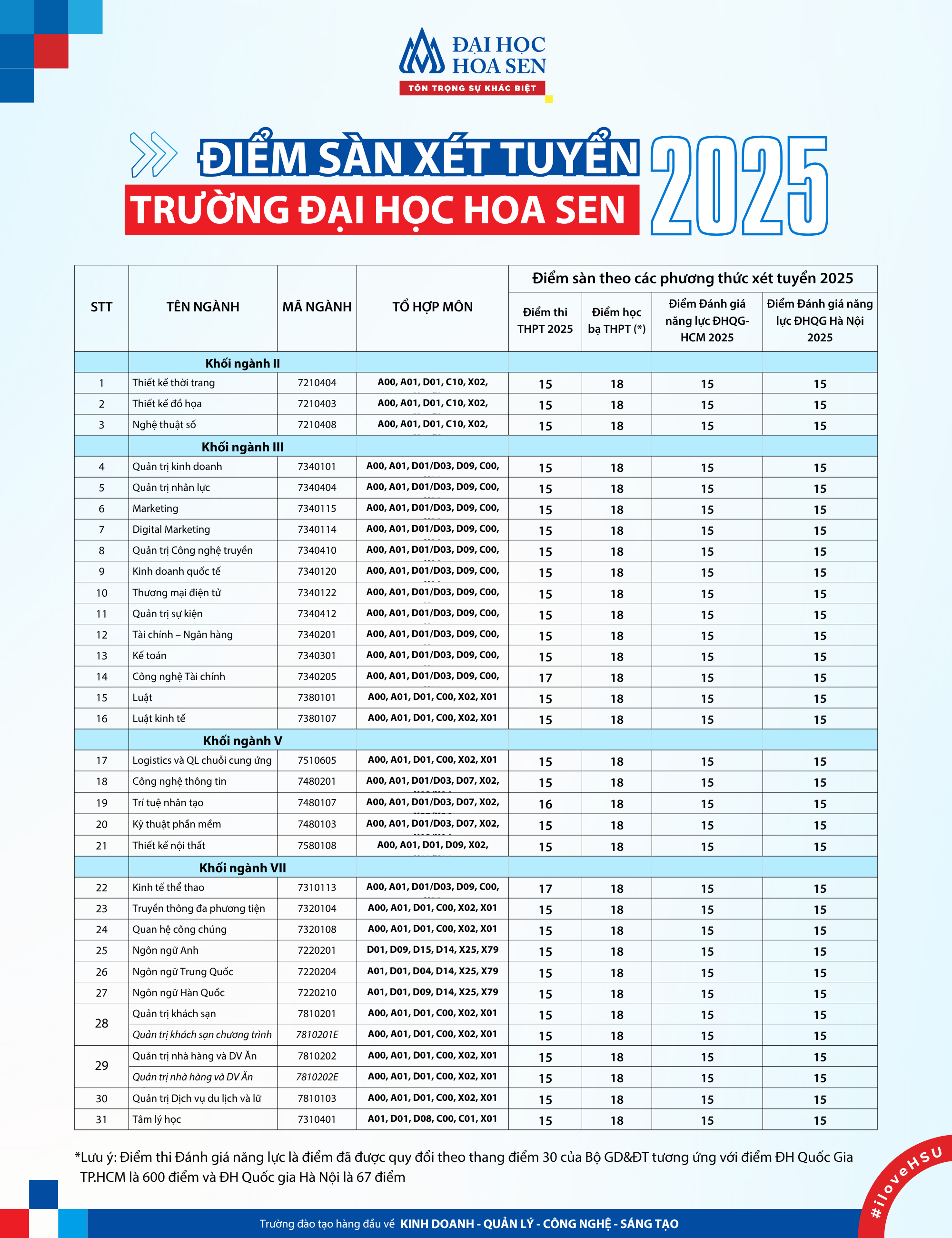 Ngày 16/07/2025, Trường Đại học Hoa Sen chính thức công bố điểm sàn xét tuyển 2025 cho 31 ngành đào tạo chính quy.