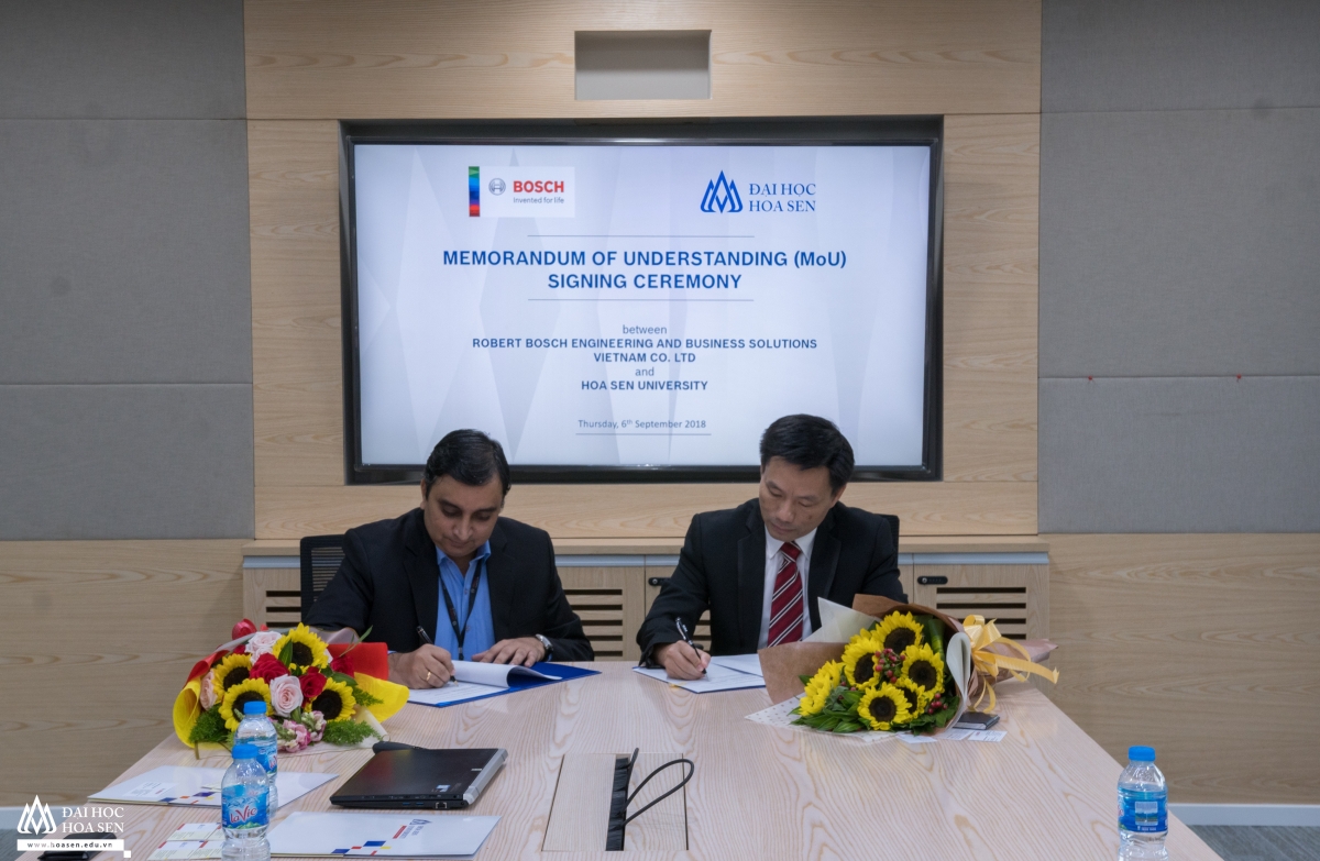 Sáng ngày 06/09/2018 lễ ký kết hợp tác giữa trường Đại học Hoa Sen và Công ty Robert Bosch Engineering and Business Solutions Việt Nam (RBVH) đã diễn ra tại văn phòng công ty.