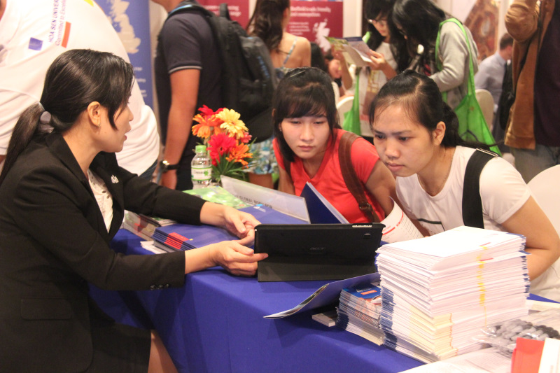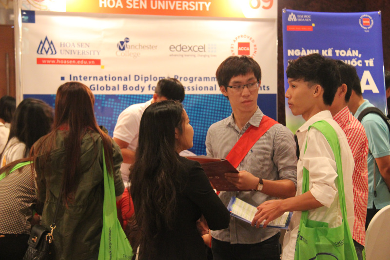 Một số gian hàng có rất nhiều người đến hỏi thông tin như trường: York St John University, University of Westminster London, University of Wareeick, University of the West of England, University of Sunderland, The Manchester College ….Tại Đại học Hoa Sen, các chương trình theo chuẩn đào tạo của Vương quốc Anh hiện có hai chương trình: Cao đẳng Manchester (với 4 chuyên ngành: QTKD, Marketing, Kế toán – Tài chính và Nhân sự) và chương trình Kế toán – Kiểm toán do Hiệp hội Kế toán Công chứng Vương quốc Anh cấp bằng cũng thu hút khá nhiều sự quan tâm của các bạn trẻ.