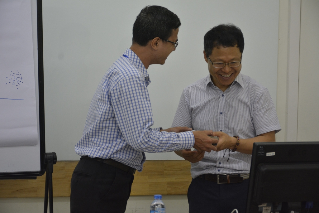 Thầy Nguyễn Hữu Phát, giảng viên Khoa khoa học & Công nghệ trao tặng quà lưu niệm cho GS Yungcheol Byun, trường ĐH Jeju (Hàn Quốc)