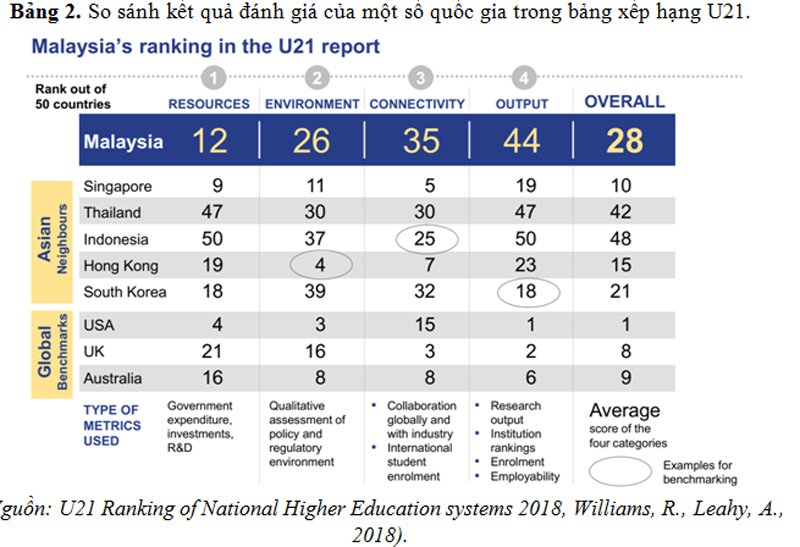 Trong các bảng xếp hạng về hệ thống giáo dục đại học quốc gia, Việt Nam vẫn chưa có mặt, dù các nước trong khu vực như Thái Lan, Malaysia đã “góp tên” ở những tốp 50. Tuy nhiên, với sự xuất hiện của 2 đại học quốc gia vào top 1.000, có thể đánh giá hệ thống đại học của Việt Nam thuộc vào nhóm 80/196 của thế giới.