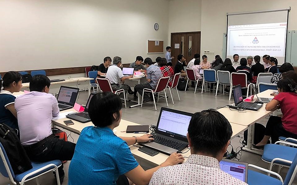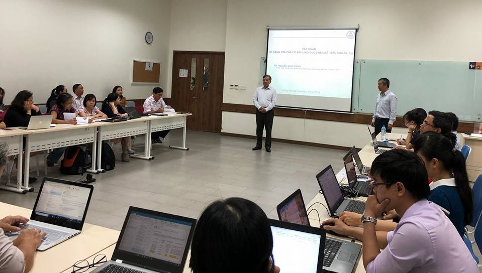 Dưới sự hướng dẫn của TS. Nguyễn Quốc Chính đến từ Trung tâm Khảo thí và Đánh giá chất lượng đào tạo thuộc Đại học Quốc gia TP.HCM, các thành viên thực hiện công tác tự đánh giá của Trường đã hiểu rõ về bộ tiêu chuẩn và bắt tay vào thực hiện các bước đầu tiên của quá trình tự đánh giá cấp cơ sở đào tạo theo bộ tiêu chuẩn mới.