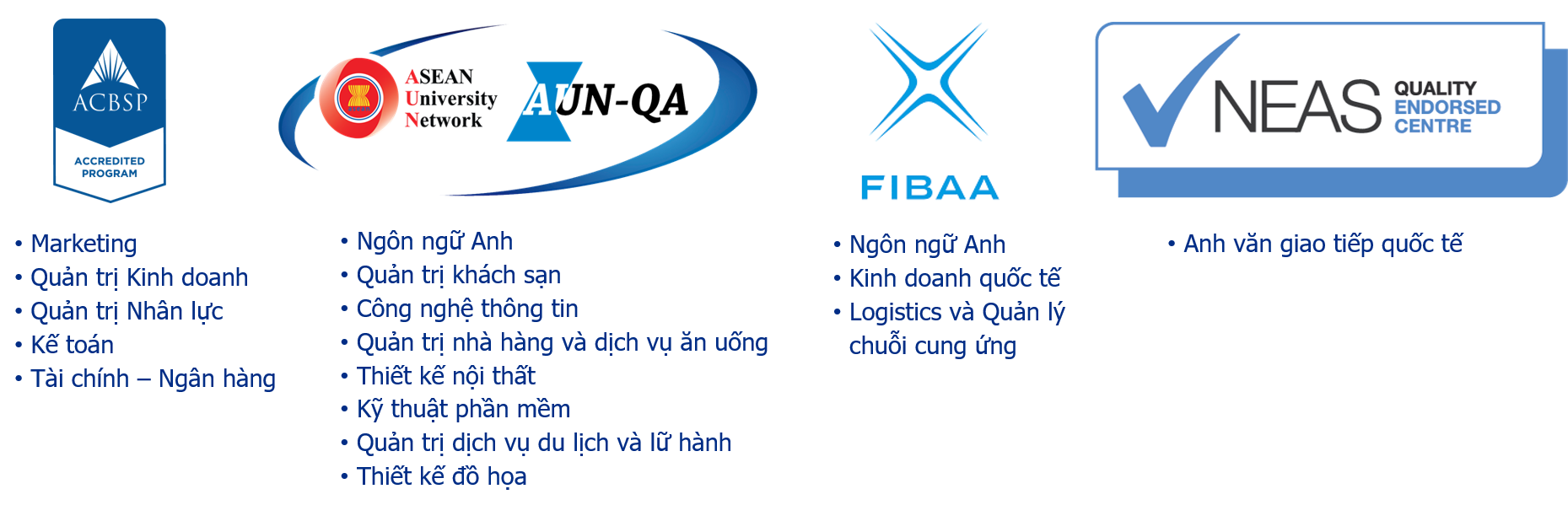 - 03 chương trình đào tạo đạt kiểm định FIBAA (Thụy Sỹ): Ngôn ngữ Anh, Kinh doanh quốc tế, Logistics và Quản lý chuỗi cung ứng.
