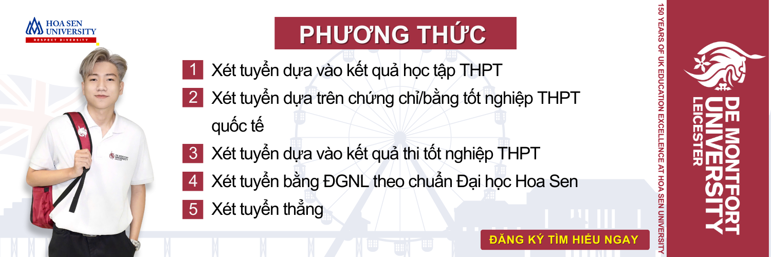 Phương thức xét tuyển Chương Trình DMU-HSU bao gồm những lựa chọn linh hoạt giúp thí sinh dễ dàng tiếp cận chương trình liên kết quốc tế chuẩn Vương Quốc Anh ngay tại Việt Nam. Mỗi phương thức được thiết kế để phù hợp với năng lực, điều kiện học tập và thế mạnh riêng của từng thí sinh, đảm bảo tối đa cơ hội trúng tuyển của các bạn thí sinh. Đồng thời, các phương thức này giúp các bạn thí sinh chủ động hơn trong việc lựa chọn hình thức xét tuyển phù hợp nhất với năng lực và mục tiêu học tập của mình.