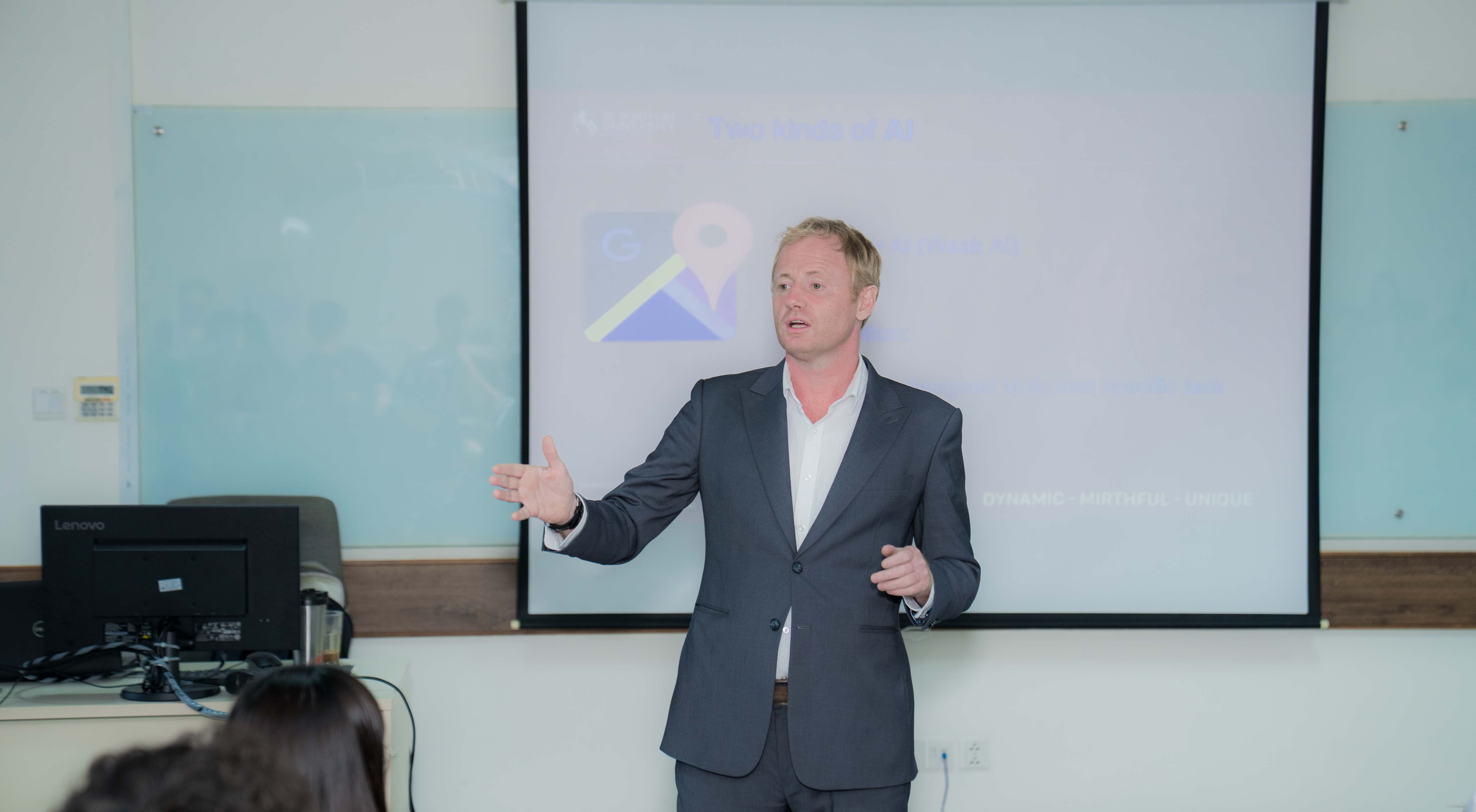 Ngay sau phần mở đầu, các bạn học sinh đã có cơ hội tham dự chuyên đề “AI trong môi trường Đại học” do TS. Edward Hockings, Giám đốc Chương trình De Montfort University – HSU Vietnam, trực tiếp giảng dạy.
