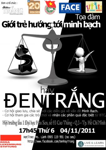 Chuỗi sự kiện Giới trẻ Hướng tới Minh bạch: “Đen hay Trắng, bạn chọn gì?” là chương trình đầu tiên với chủ đề “Giới trẻ, Minh bạch và Tham nhũng” được thực hiện trên quy mô cả 3 miền Bắc – Trung – Nam. Chuỗi sự kiện được tổ chức nhằm hưởng ứng ngày Quốc tế Phòng chống Tham nhũng 09/12/2011. Với mục đích nâng cao nhận thức, tạo sân chơi cho giới trẻ tìm hiểu và chia sẻ về các vấn đề Minh bạch & Tham nhũng, chương trình sẽ giới thiệu và khai thác những góc nhìn mới song lại gần gũi về vấn đề này trong cuộc sống hàng ngày. Từ đó, các bạn trẻ sẽ có những hành động cụ thể, thiết thực để nâng cao tính “Minh bạch” – một trong những yếu tố không thể thiếu cho sự phát triển bền vững của xã hội.