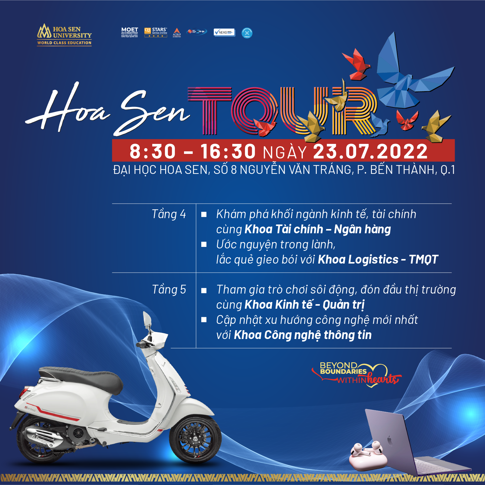 Đặc biệt hơn bao giờ hết, các bạn sẽ có cơ hội nhận được các giải thưởng giá trị: Xe Vespa, Macbook, Airpods,… và nhiều phần quà hấp dẫn khác. Ngày hội “Hoa Sen Tour” diễn ra duy nhất một ngày 23/07/2022, hứa hẹn sẽ mang đến một không khí bùng nổ và nhiều hoạt động thú vị, các bạn nhớ đến tham gia nhé!