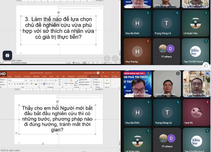 Ở phần thảo luận, các diễn giả đã dành thời gian trả lời câu hỏi, chia sẻ những kinh nghiệm được đúc kết từ quá trình nghiên cứu và triển khai dự án thực tế. Sinh viên nhận được nhiều gợi mở về phương pháp tiếp cận đề tài, cách vượt qua khó khăn và cách giữ tinh thần bền bỉ khi theo đuổi nghiên cứu khoa học.
