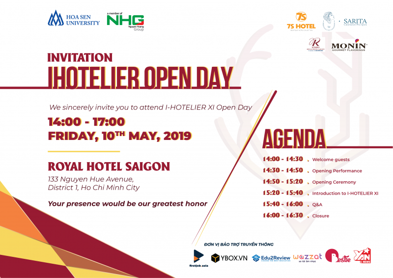 I-Hotelier lần thứ XI sẽ chính thức khởi động vào ngày 10/5/2019 tại Khách sạn Royal Hotel Saigon. Đây là một cuộc thi trong lĩnh vực khách sạn – nhà hàng do sinh viên Khoa Du lịch Trường Đại học Hoa Sen tổ chức. Sau 10 lần tổ chức thành công, I-Hotelier đã mang đến một sân chơi bổ ích bên cạnh những kiến thức, trải nghiệm thú vị cho thí sinh cũng như nhận được những đánh giá cao từ các chuyên gia trong ngành.