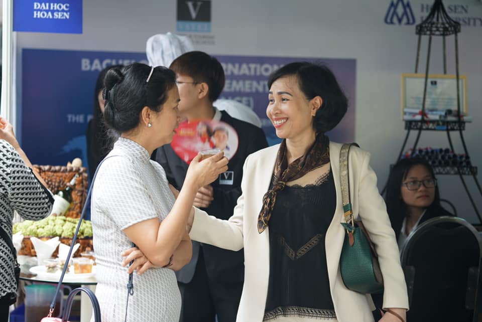 Nhà giáo ưu tú – Giáo sư – Tiến sĩ Mai Hồng Quỳ, Hiệu trưởng trường Đại học Hoa Sen (bên phải) tại ngày hội.