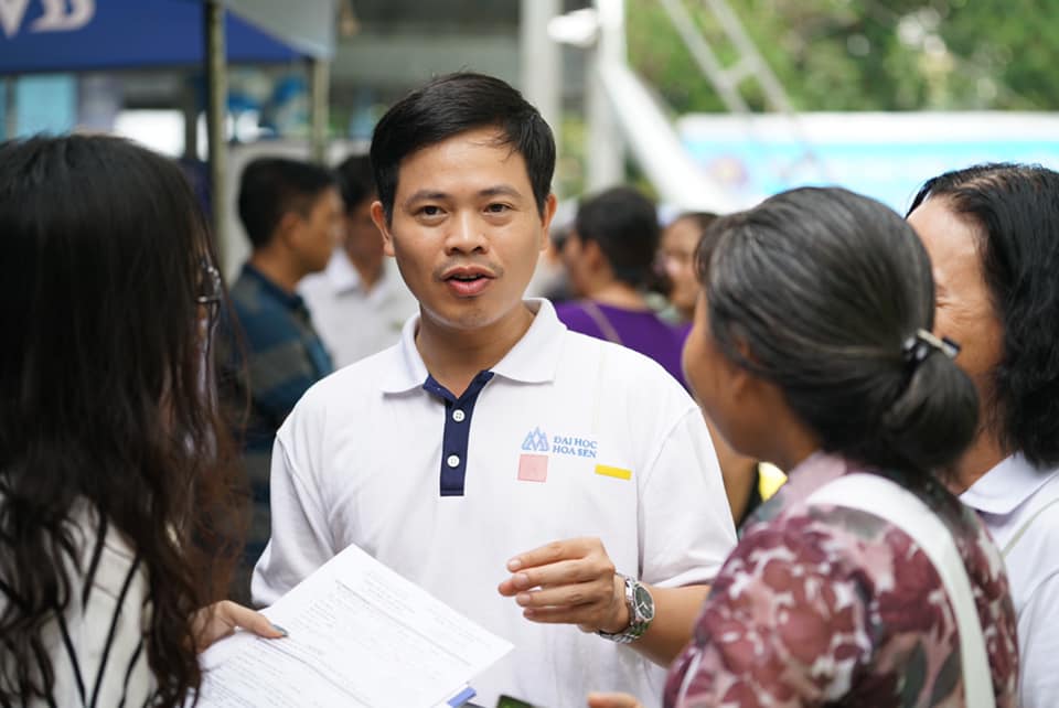 Anh Nguyễn Việt Thái, Phó Trưởng phòng Phòng Tuyển sinh và Truyền thông, trường Đại học Hoa Sen tư vấn cho nữ sinh xét tuyển vào trường.