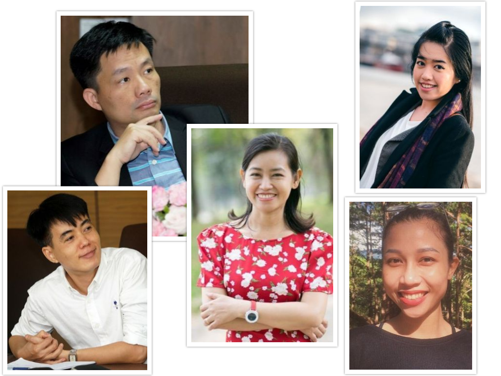 Các nhân sự của dự án: ThS. Trương Nguyễn Bảo Trân (Quản lý dự án, hình giữa), TS. Vũ Tường Thụy, Phó Hiệu trưởng trường Đại học Hoa Sen (Cố vấn dự án, hình phía trên bên trái), TS. Nguyễn Minh Anh (Chuyên gia đào tạo, Trung tâm Hỗ trợ Nghiên cứu và Phát triển Khoa học, hình phía dưới bên trái) và TS. Giang Thúy Minh (Khoa Khoa học và Kỹ thuật, hình phía trên bên phải) và Điều phối dự án: Trương Thị Kim Oanh.