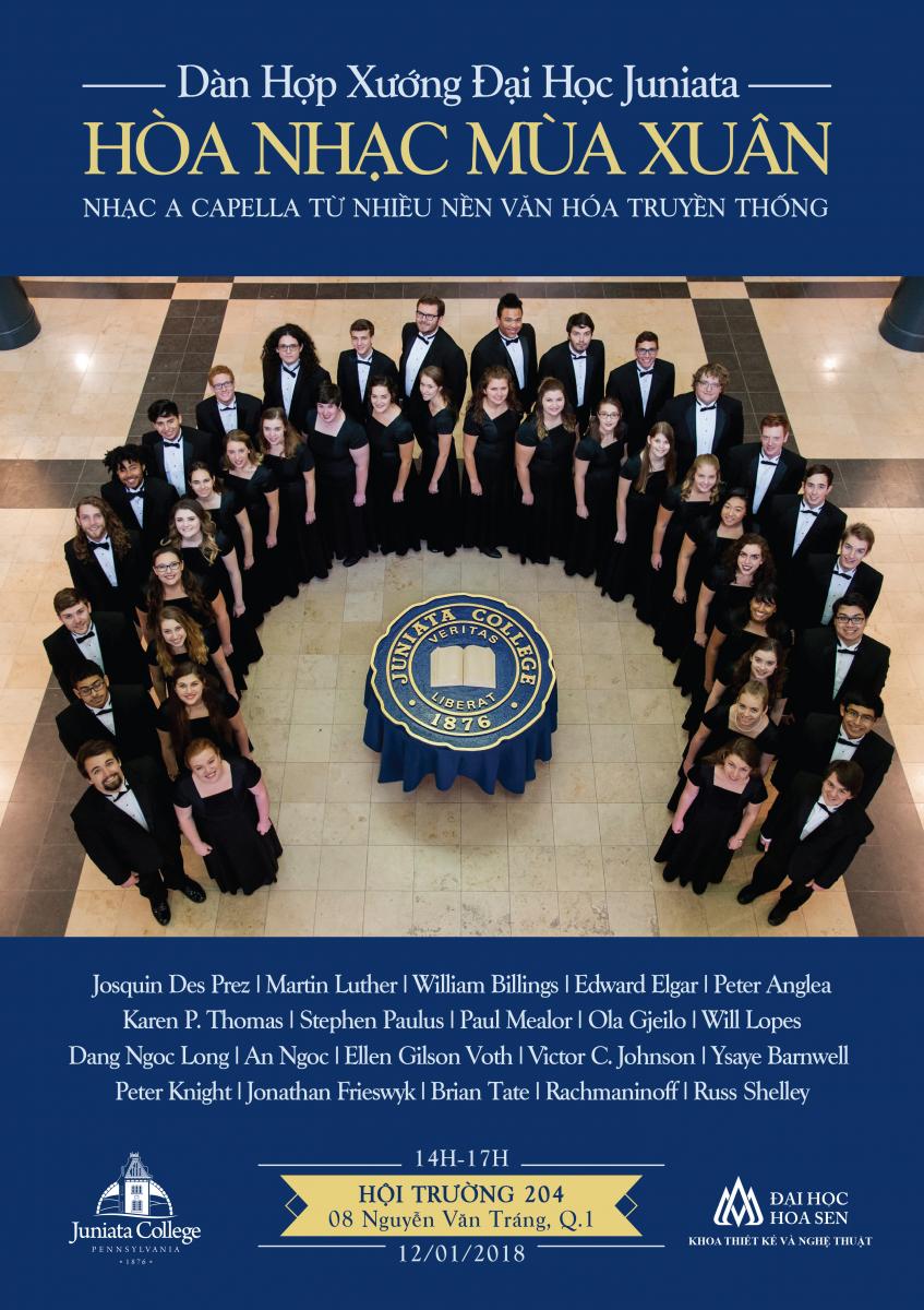 Với chủ đề là “Hoà Nhạc Mùa Xuân”, thể loại nhạc A Capella sẽ được trình diễn từ nhiều nền văn hoá truyền thống khác nhau. Các bài hát từ năm 1440 đến nay sẽ được trình diễn tại buổi hoà nhạc. Bên cạnh đó, dàn hợp xướng còn trình diễn bài “Bèo Dạt Mây Trôi” và “Trống Cơm” theo thể loại A Capella. Đến với trường Đại Học Hoa Sen, dàn hợp xướng của trường Juniata College gồm có 41 người và 1 nhạc trưởng.