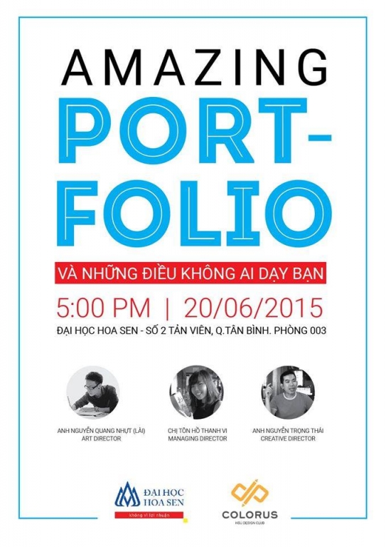 Đây là buổi Talk show dành cho chính bạn. Đừng bỏ lỡ cơ hội vì bạn sẽ giao lưu trực tiếp với siêu Art Director trẻ đẹp Nguyễn Quang Nhựt (Anh Lài), Giám đốc điều hành kiêm Creative Director vô cùng năng động Tôn Hồ Thanh Vi, và Creative Director siêu chuyên nghiệp Nguyễn Trọng Thái.