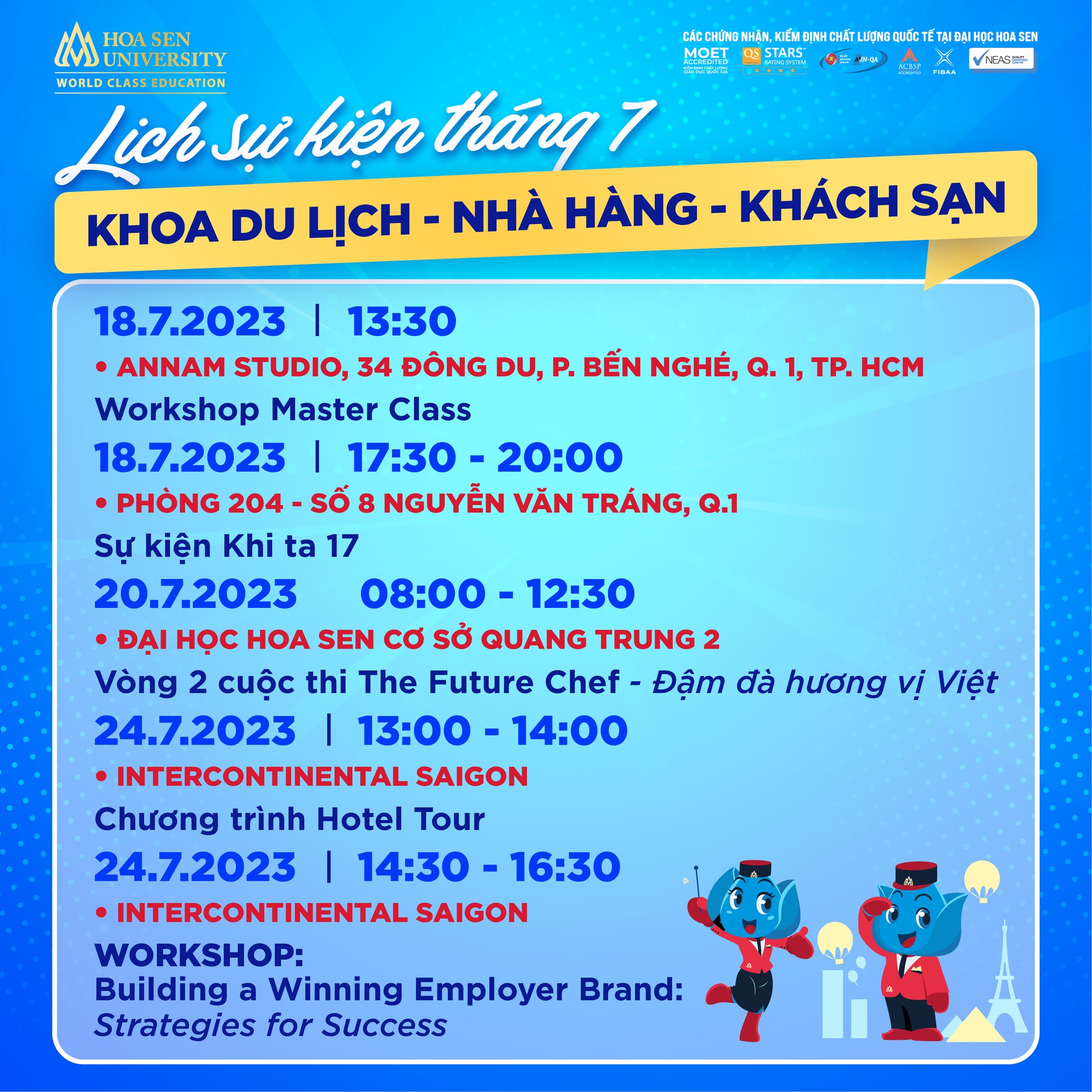 - Trải nghiệm nghề nghiệp qua các workshop chuyên ngành về khách sạn, nhà hàng, thiết kế…