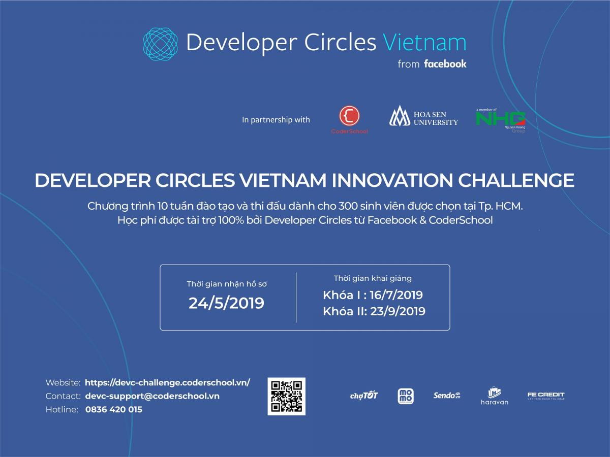 Để nâng cao trình độ cho sinh viên đang theo học chuyên ngành công nghệ thông tin tại Việt nam và cung cấp cho các em kiến thức về các công nghệ mới, phát triển các kỹ năng mềm cần thiết để sẵn sàng đi làm. Facebook hợp tác cùng CoderSchool triển khai chương trình “Developer Circles Vietnam Innovation Challenge” – chương trình kết hợp giữa đào tạo và thi đấu kéo dài 18 tháng tại Thành phố Hồ Chí Minh, Hà Nội và Đà Nẵng. Nội dung đào tạo bao gồm: React Native, Product Management và Data Science (Machine Learning).