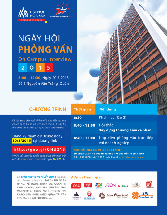 Ngày hội Phỏng vấn (On Campus Interview) Lần 1/2015 sẽ diễn ra tại cơ sở Nguyễn Văn Tráng, trường Đại học Hoa Sen. Ngày Hội dự kiến sẽ thu hút hơn khoảng 11 doanh nghiệp tham gia như: Công ty CSC, công ty Harvey Nash, công ty FPT Online, AEON, Ngân hàng SCB, ngân hàng VPBank, khách sạn Caravelle, khách sạn Equatorial, Công ty Alsimexco, công ty Logiworld, công ty Siêu Nhật Thanh (SNT).
