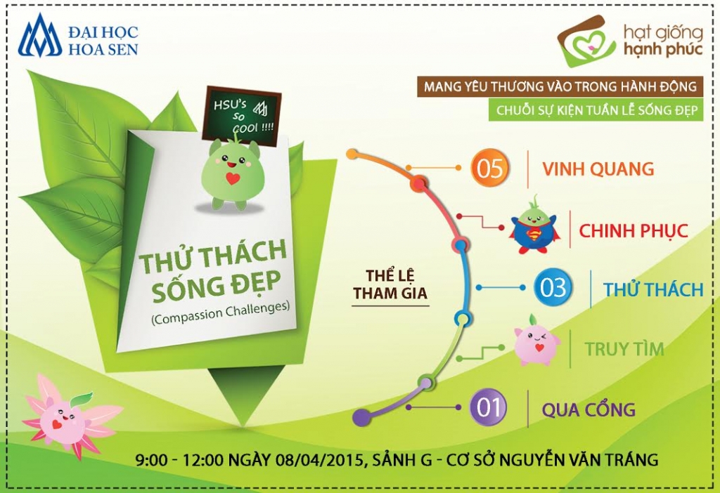 Mong muốn khơi gợi, vun đắp và lan tỏa các giá trị sống thật đẹp vốn tiềm ẩn từ chính trong mỗi con người Hoa Sen, thành viên Dự án Hạt giống Hạnh phúc tổ chức sự kiện Gameshow “Thử thách sống đẹp”.Thông qua những trò chơi và yêu cầu thực tế, chương trình mong muốn sẽ đánh thức những hành động dù thật nhỏ, nhưng chứa đựng nhiều giá trị nhân văn mang đến cho cả người cho và người nhận một sự hạnh phúc”. Sự kiện này nằm trong chuỗi hoạt động tuần lễ Sống đẹp “Mang yêu thương vào trong hành động”.