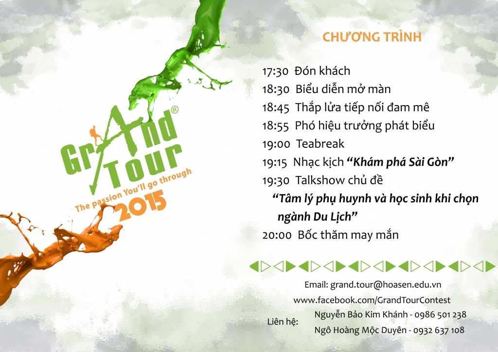 Sau khoảng thời gian dài chuẩn bị chu đáo tất cả mọi việc, ngày 24/04/2015 Grand Tour – đề án của Khoa Ngôn Ngữ Văn Hóa Học, trường Đại học Hoa Sen sẽ tổ chức một buổi Open Day giới thiệu chương trình, kết hợp với nhạc kịch nhằm gởi đến các bạn một không gian tuyệt vời cũng như ấn tượng sâu sắc trong phiên bản Grand Tour Campaign 2015 mùa thứ 5.