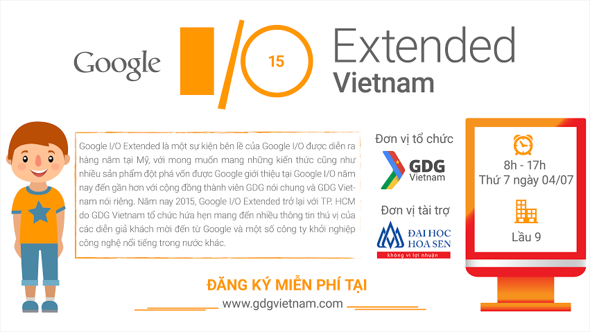 Google I/O Extended là một sự kiện bên lề của Google I/O được diễn ra hàng năm tại Mỹ, với mong muốn mang những kiến thức cũng như nhiều sản phẩm đột phá vốn được Google giới thiệu tại Google I/O năm nay đến gần hơn với cộng đồng thành viên GDG nói chung và GDG Vietnam nói riêng. Năm nay 2015, Google I/O Extended trở lại với TP. HCM do GDG Vietnam tổ chức hứa hẹn mang đến nhiều thông tin thú vị của các diễn giả khách mời đến từ Google và một số công ty khởi nghiệp công nghệ nổi tiếng trong nước khác.