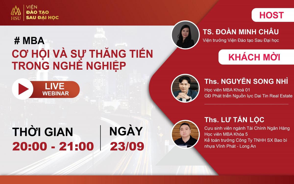 Nếu bạn vẫn đang băn khoăn về lựa chọn của mình trong việc tìm kiếm một chương trình đào tạo MBA để theo đuổi, hãy cùng tham gia buổi Webinar của Viện Đào tạo Sau Đại học để cùng trao đổi và chia sẻ về những thông tin trên. Chương trình sẽ có sự góp mặt của các cựu học viên đã tham gia các khóa MBA của Trường Đại học Hoa Sen.
