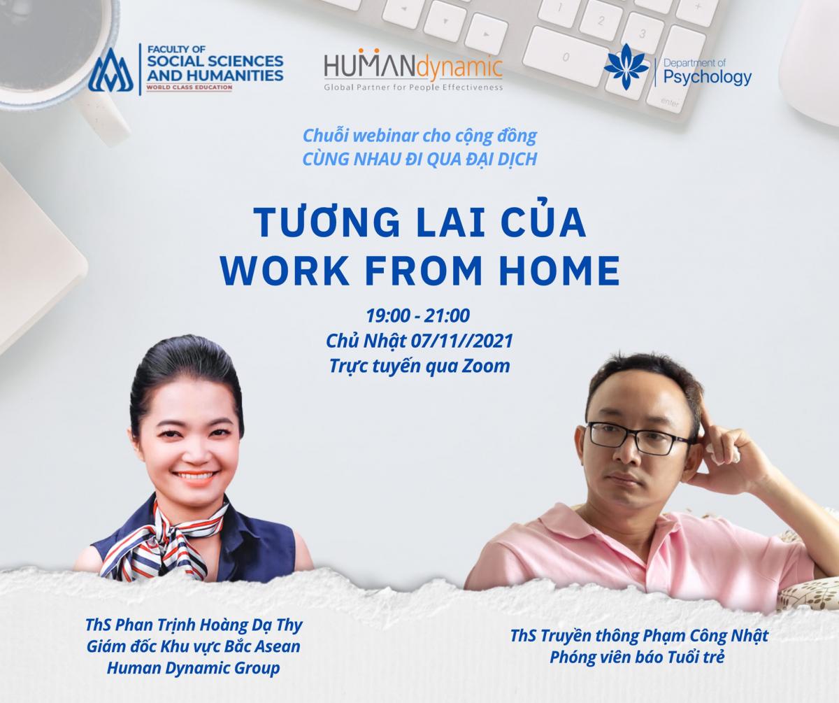 Hiện tại, dù thành phố Hồ Chí Minh và một số tỉnh thành bắt đầu quay trở lại với môi trường làm việc thông thường. Tuy nhiên, làm việc trực tuyến vẫn là một định hướng phát triển cho tương lai. Webinar TƯƠNG LAI CỦA WORK FROM HOME lần này sẽ tập trung tìm hiểu những cơ hội, thách thức do Work from home mang lại, đặc biệt trên khía cạnh tâm lý và sức khỏe tinh thần.
