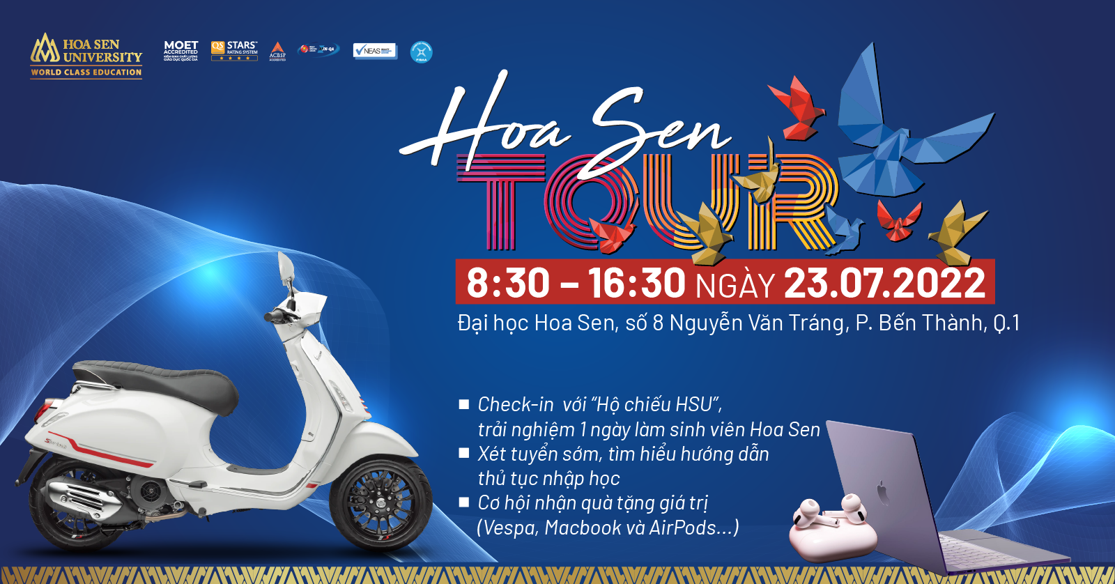 Đến với Hoa Sen Tour, bạn sẽ được check in “Hộ chiếu HSU” cực xịn sò, hô biến trở thành Sen-ers trải nghiệm mọi ngóc ngách và tham gia những chương trình độc quyền chỉ dành riêng cho sinh viên nhà Sen. Đặc biệt, đi chơi còn có cơ hội nhận ngay Vespa, Macbook, AirPods cùng nhiều phần quà hấp dẫn khác.