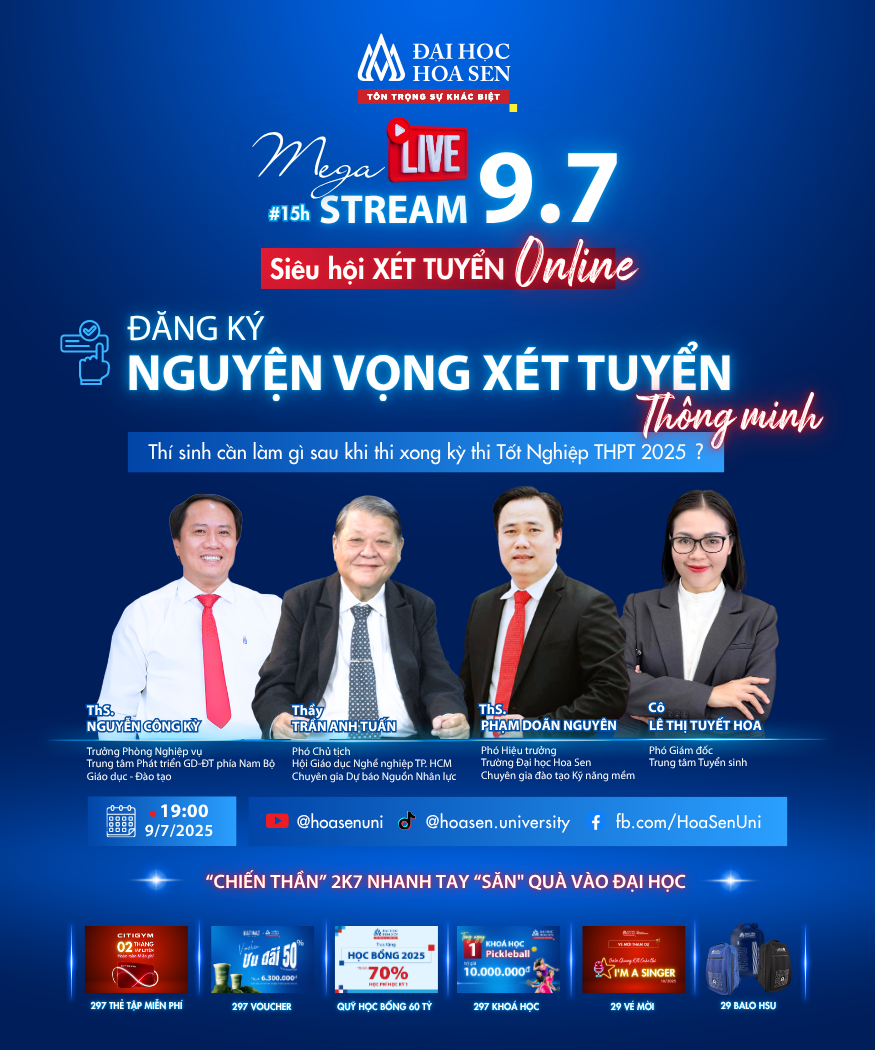 Ngày 9/7/2025, Trường Đại học Hoa Sen tổ chức MegaLive – Siêu hội xét tuyển online HSU dành riêng cho các thí sinh 2K7 đang bước vào giai đoạn quyết định: đăng ký nguyện vọng xét tuyển Đại học.
