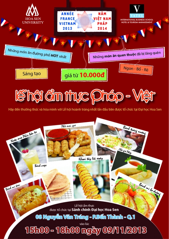Le samedi 09/11/2013, le Festival de la Gastronomie Franco-Vietnamienne va avoir lieu à l’université Hoa Sen, située au N°8, rue Nguyễn Văn Tráng, 1er arrondissement, HCM ville. Le festival s’inscrit dans un ensemble de activités organisées pour saluer les 40 années des relations diplomatiques entre le Vietnam et la France. Elle sera orchestrée par le duo Hoa Sen et Vatel Hochiminh – Ecole Internationale d’hôtellerie et de management.