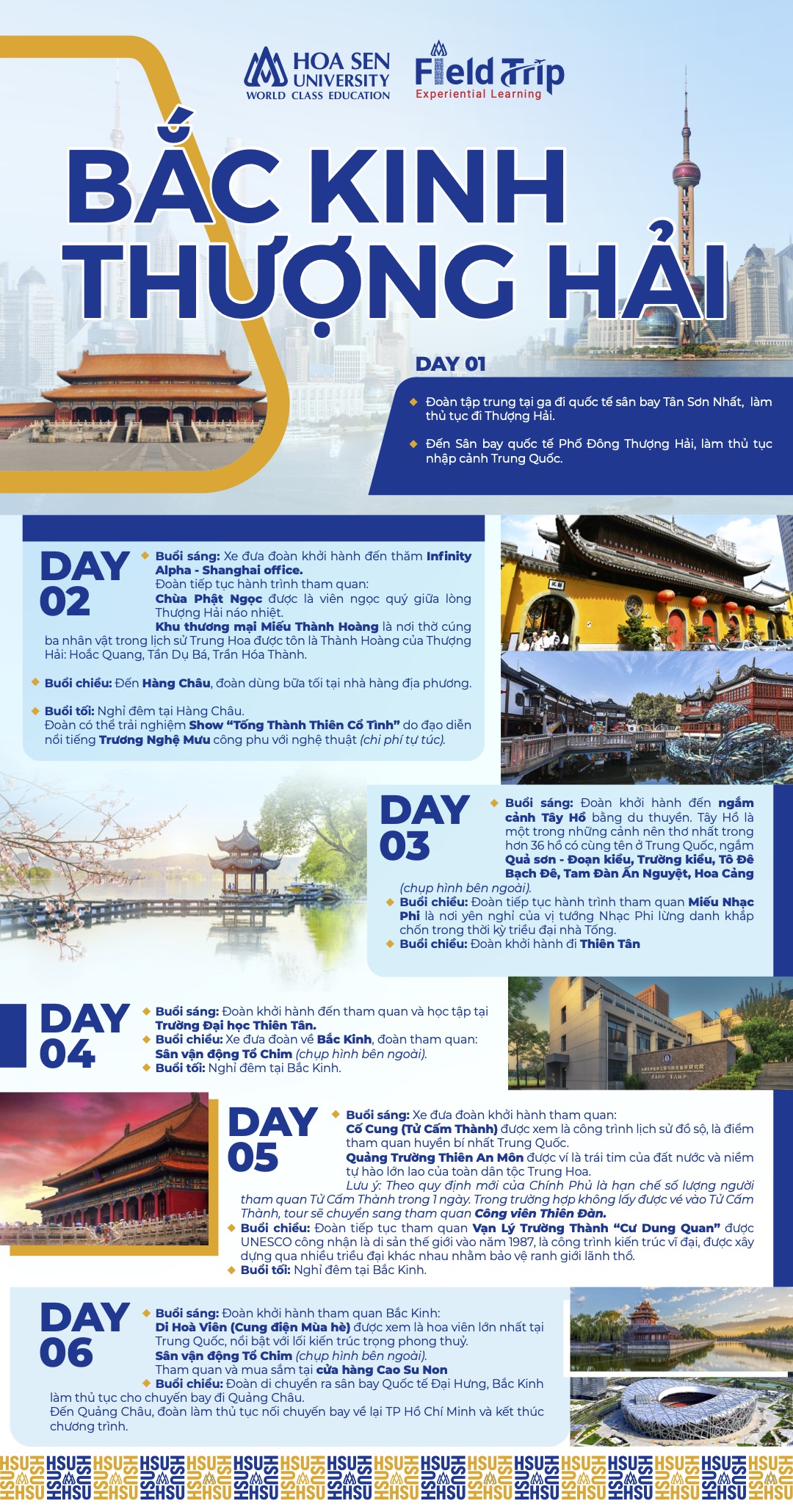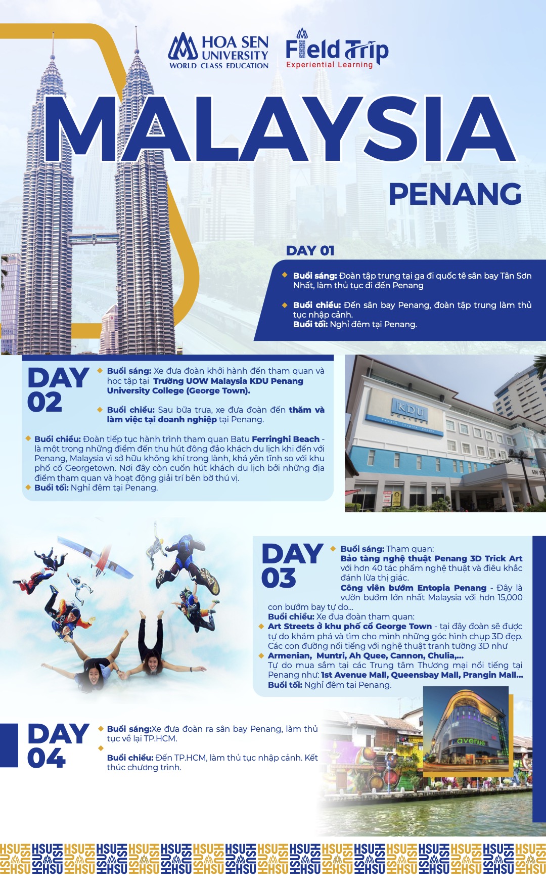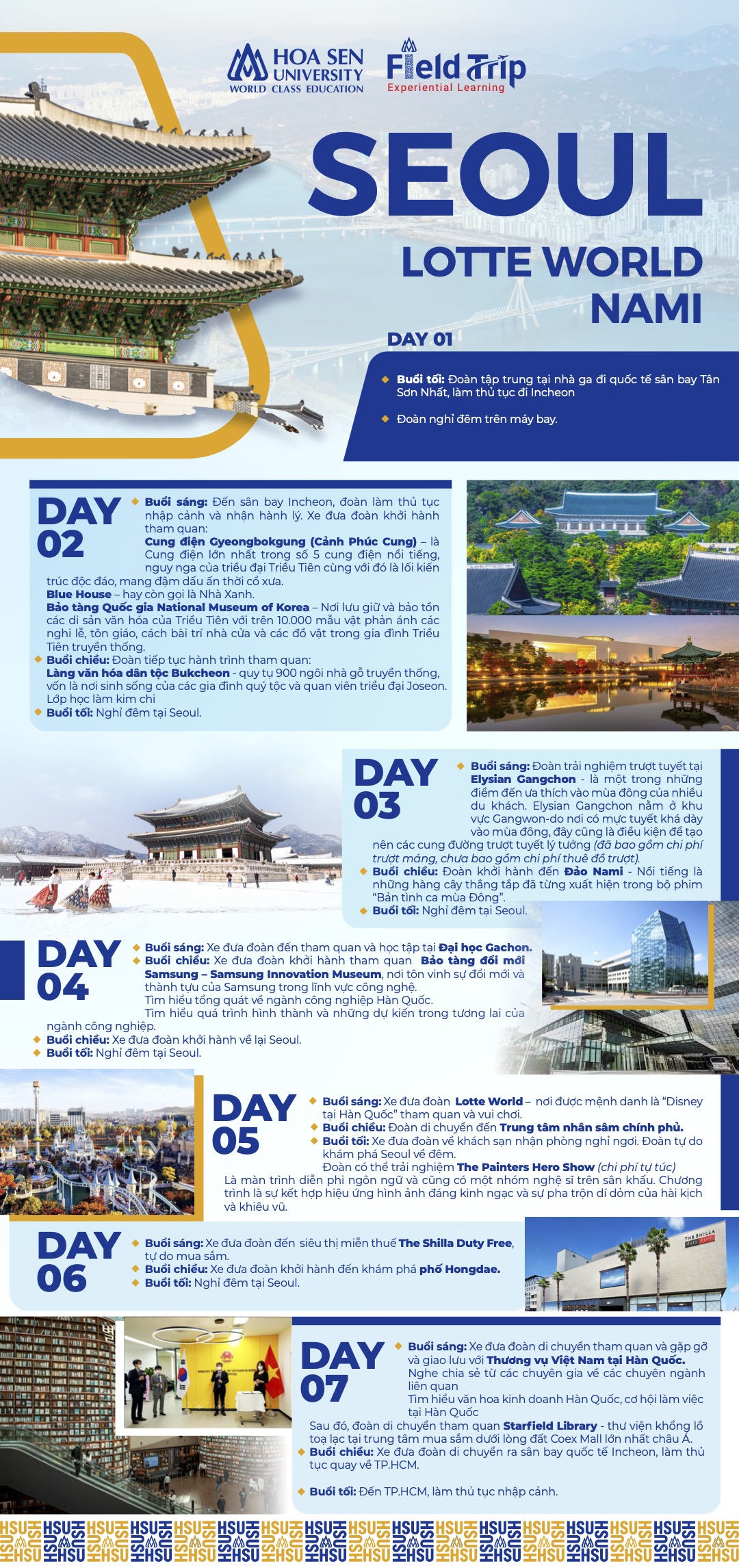 Chương trình Field trip là chương trình trải nghiệm mà Trường Đại học Hoa Sen tổ chức cho sinh viên của trường nhằm tạo điều cho sinh viên hội nhập quốc tế, giúp sinh viên có những trải nghiệm thực tế tại các môi trường chuyên nghiệp trên thế giới. Từ đó góp phần giúp cho sinh viên phát triển toàn diện từ kiến thức đến kỹ năng và tư duy phát triển, tạo tiền đề cho sự thành công trong tương lai của sinh viên.