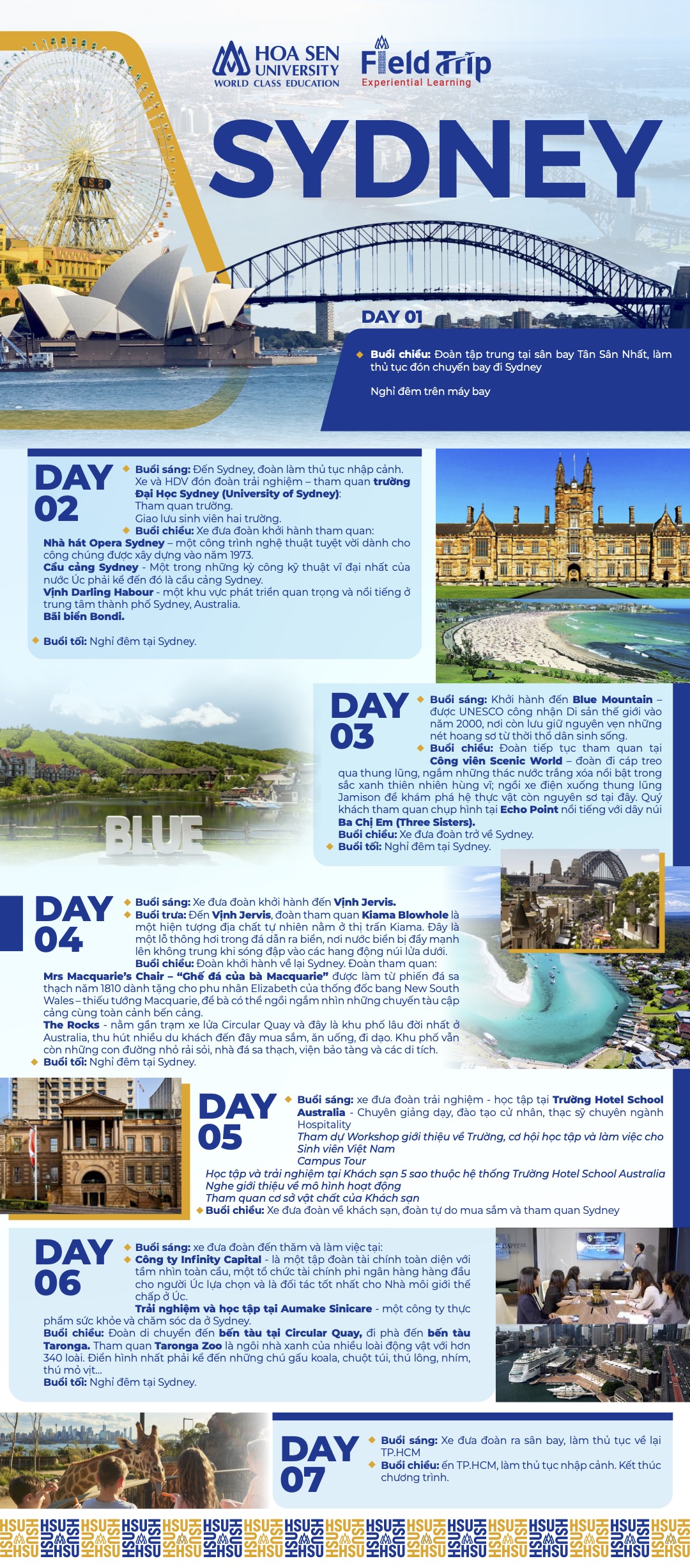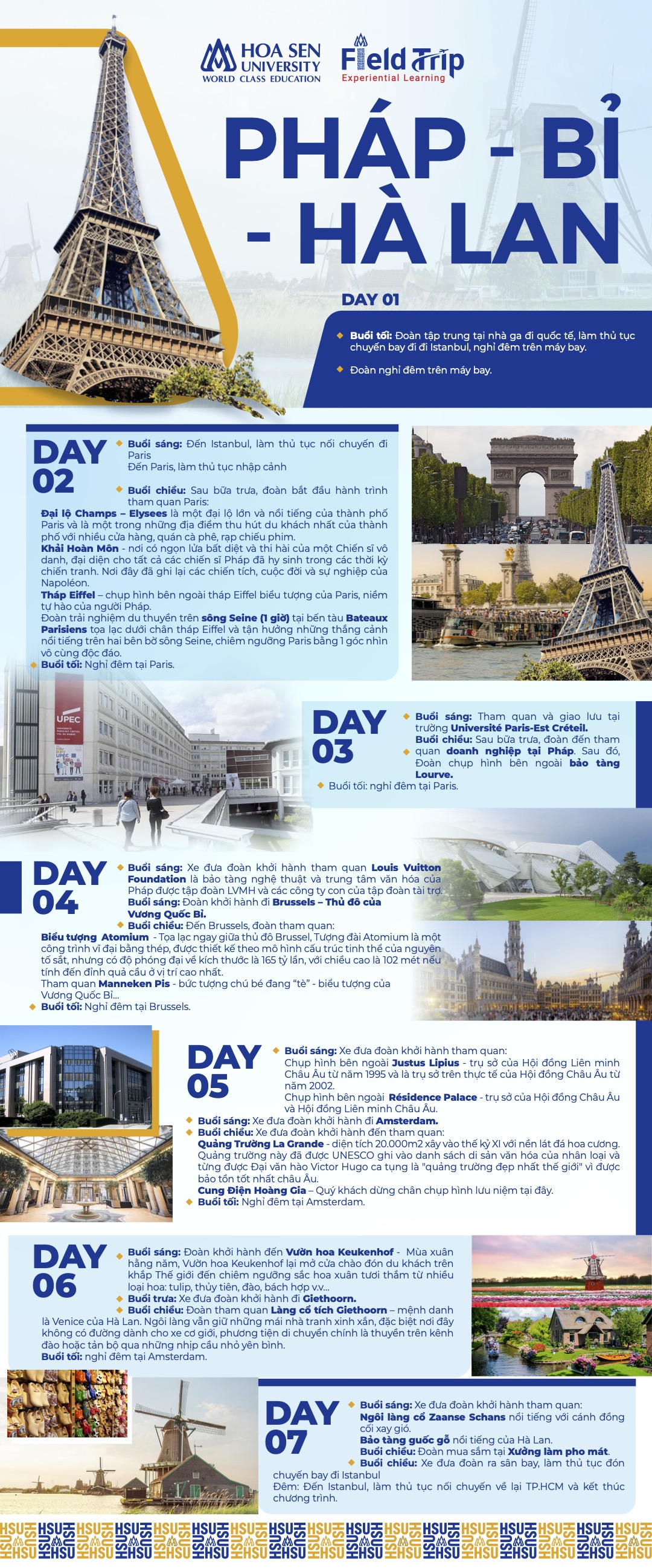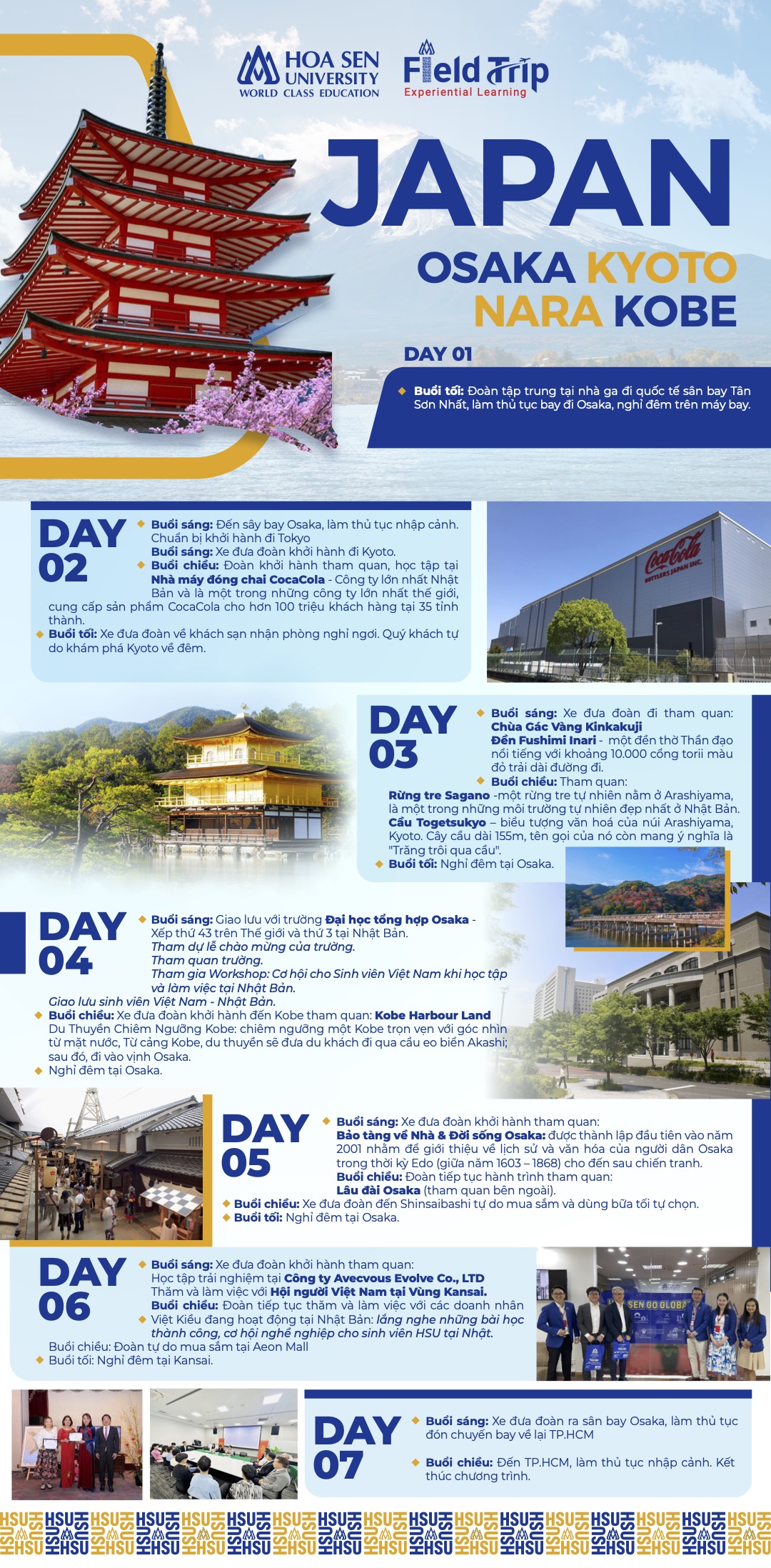 Chương trình Field trip là chương trình trải nghiệm mà Trường Đại học Hoa Sen tổ chức cho sinh viên của trường nhằm tạo điều cho sinh viên hội nhập quốc tế, giúp sinh viên có những trải nghiệm thực tế tại các môi trường chuyên nghiệp trên thế giới. Từ đó góp phần giúp cho sinh viên phát triển toàn diện từ kiến thức đến kỹ năng và tư duy phát triển, tạo tiền đề cho sự thành công trong tương lai của sinh viên.