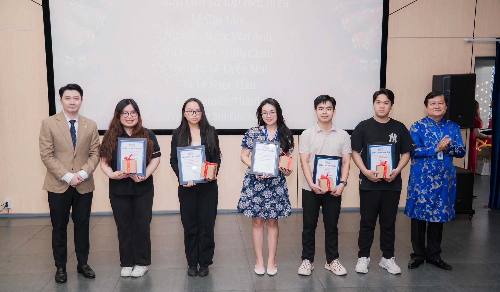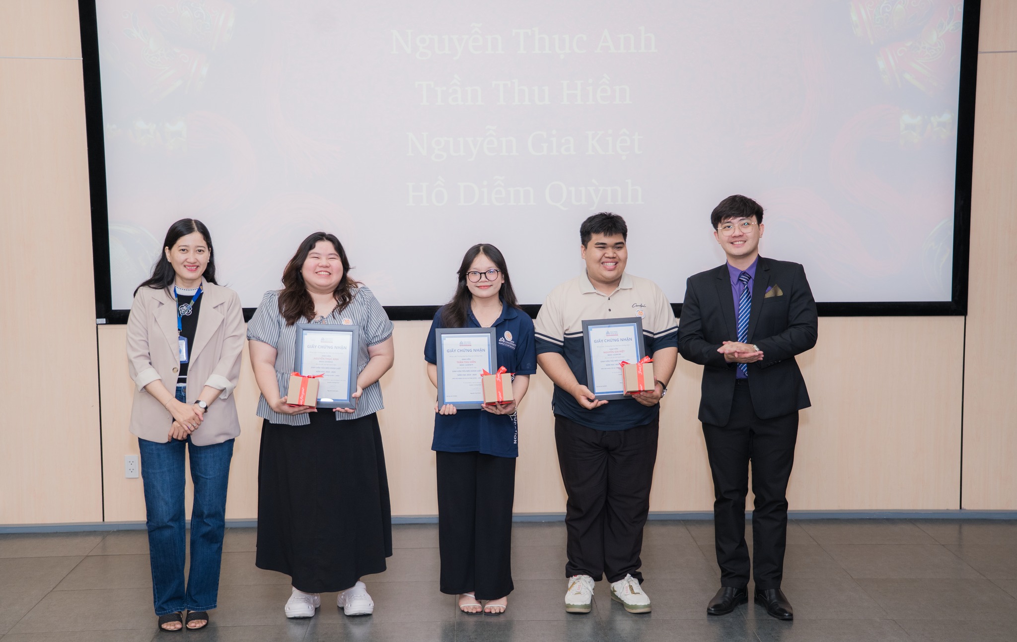 Bên cạnh những phần thưởng học thuật, các bạn sinh viên còn nhận được những món quà Tết ấm áp từ các thầy cô và doanh nghiệp, thể hiện sự quan tâm và tình cảm chân thành. Đặc biệt, các sinh viên xuất sắc còn nhận Giấy khen từ TS. Nguyễn Hoài Nam – Quyền Trưởng khoa Khoa Luật. Cùng với đó là các phần quà tặng từ các đơn vị đối tác như Công ty Luật TNHH Kim Ngọc và Văn phòng Luật sư Minh Thiên.