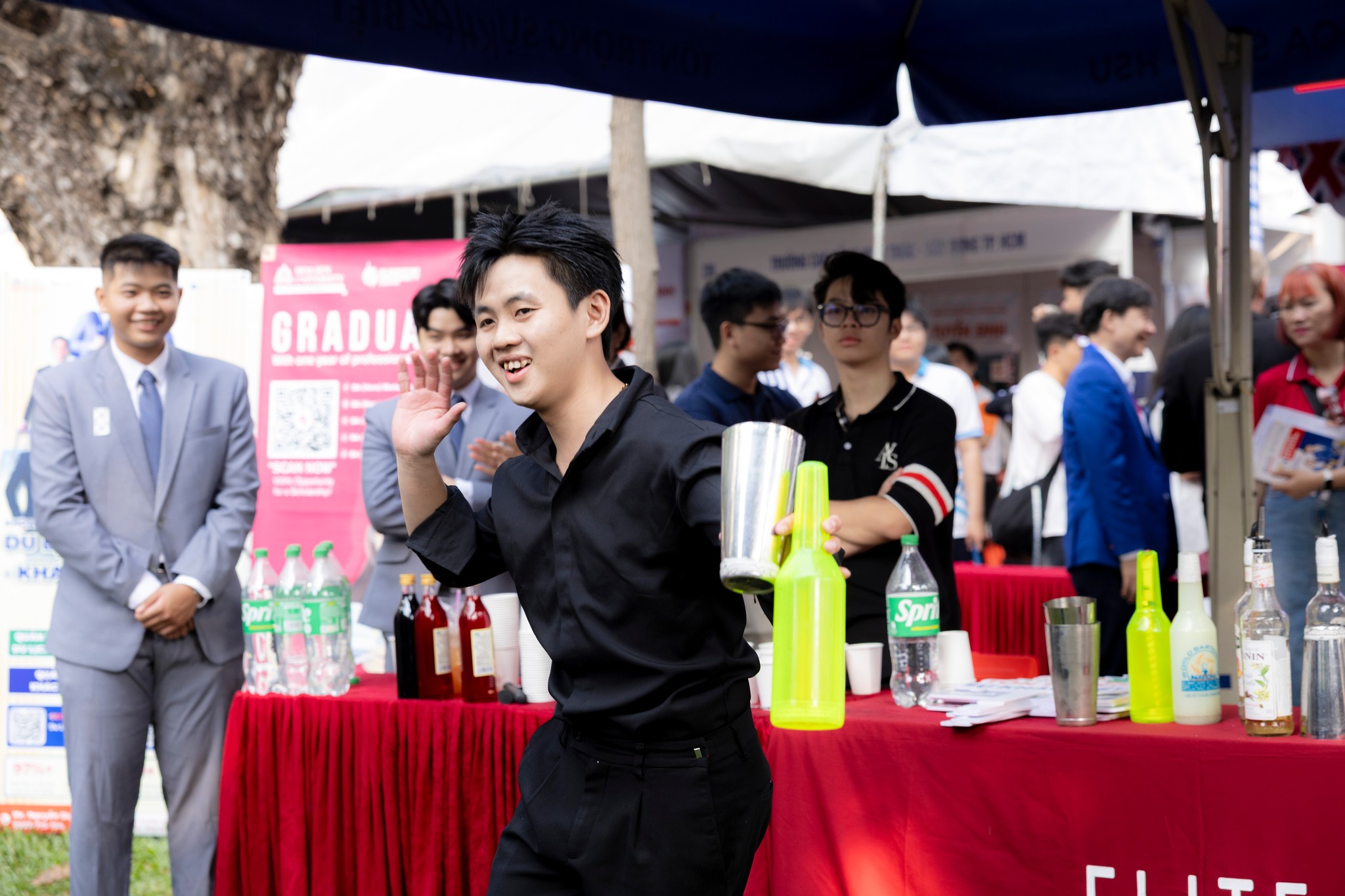 Không khí càng thêm sôi động với các tiết mục biểu diễn bartender, giao lưu văn nghệ và mascot, cùng khu vực gian hàng ẩm thực thu hút đông đảo học sinh tham gia.