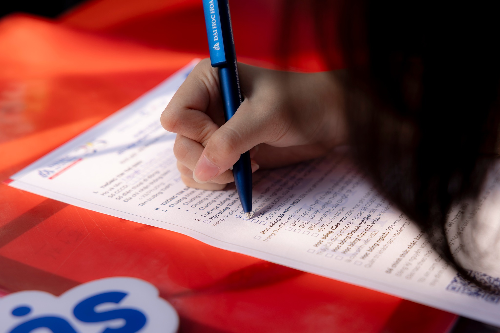Một trong những điểm nhấn tại gian hàng HSU là hoạt động đăng ký xét học bổng tuyển sinh 2026. Ngay từ sớm, nhiều học sinh đã ghé đến tìm hiểu thông tin và hoàn tất thủ tục đăng ký xét học bổng tại gian hàng HSU.