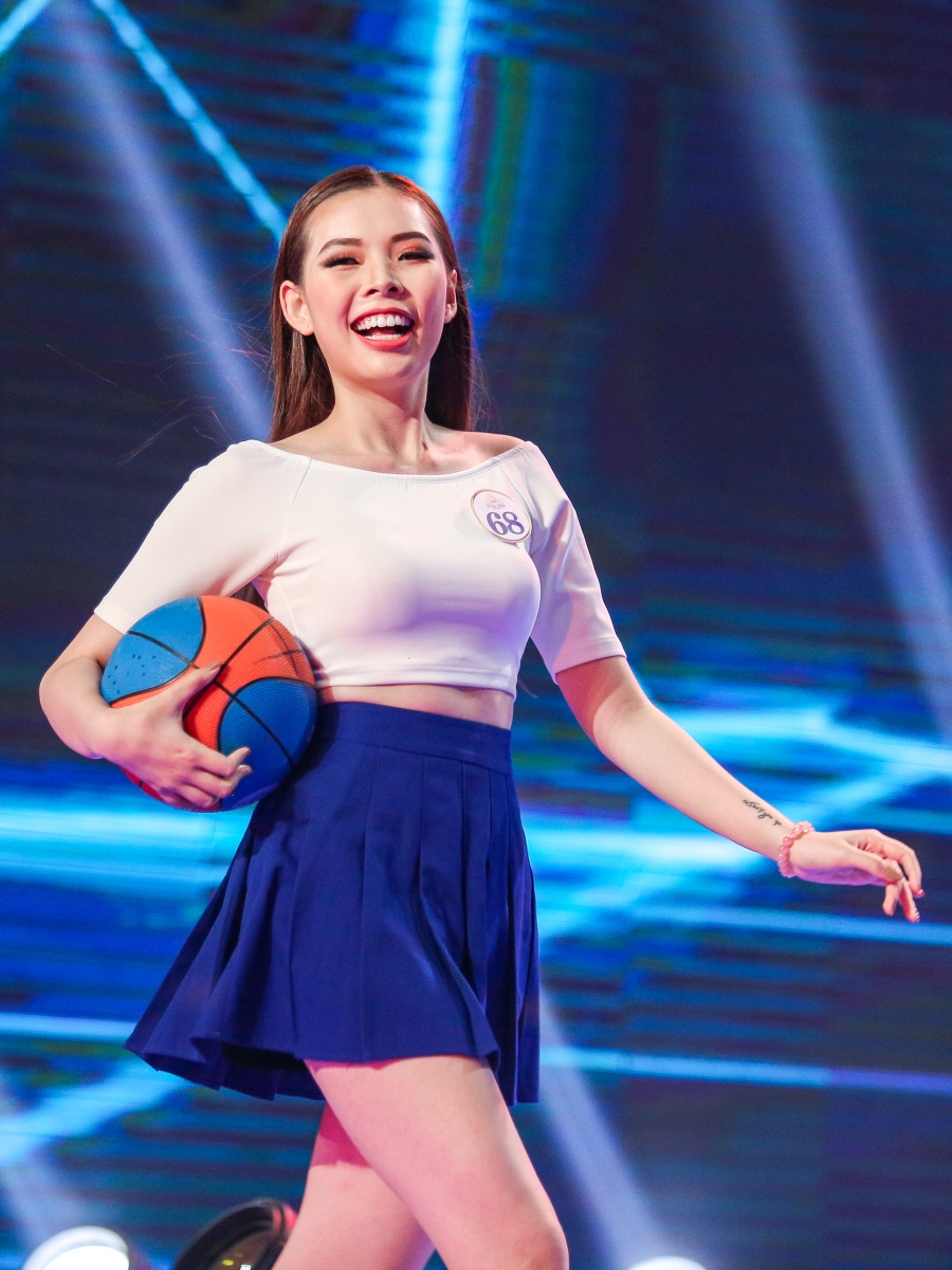 Trong phần thi trình diễn trang phục thể thao, Phương Thy khỏe khoắn và trẻ trung.