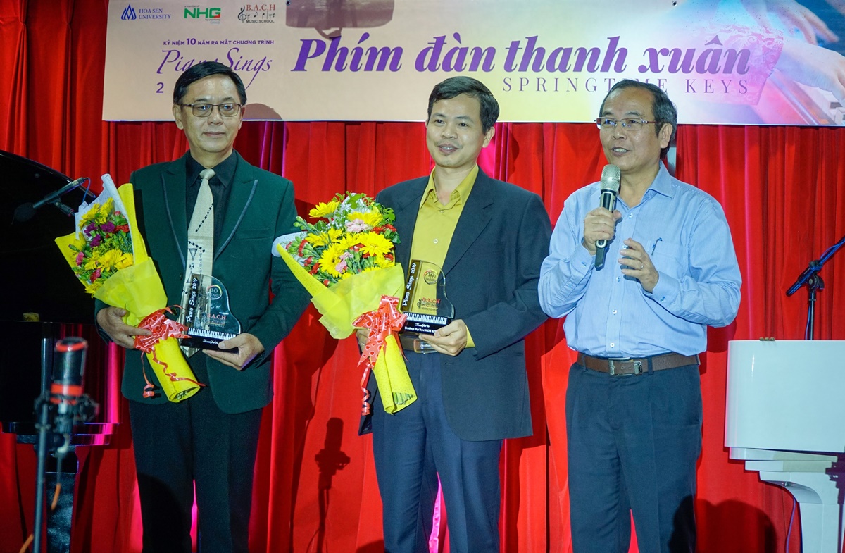 TS Đỗ Mạnh Cường, đại diện Tập đoàn Nguyễn Hoàng trao tặng kỷ niệm chương và hoa cho đại diện trường Đại học Hoa Sen và trường Âm nhạc B.A.C.H.