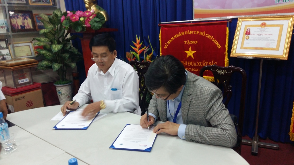 Representative of Hoa Sen University (right) and Tran Phu High School at a working session.